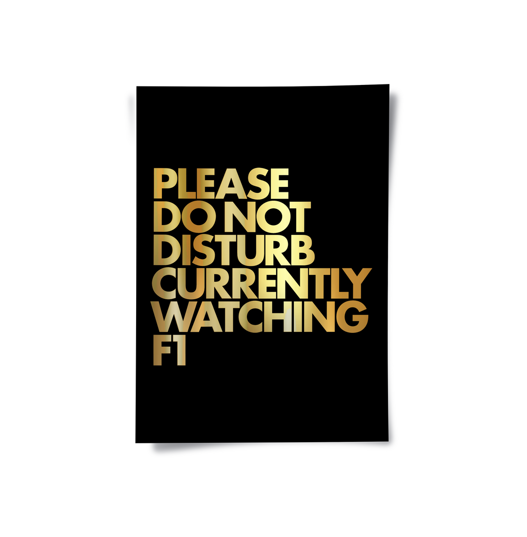 The bold Fan Do Not Disturb - F1 Gold Typography print is the ultimate statement piece for the Formula 1 enthusiast. The dramatic, high-impact message "PLEASE DO NOT DISTURB CURRENTLY WATCHING F1" is rendered in bold, metallic gold, modern sans-serif typography. The powerful gold text is set against a deep black canvas with a sophisticated, vertical ribbed texture, offering a luxurious, high-contrast aesthetic. This artwork is a must-have for the home theater, man cave, or living room of any dedicated F1 fan in Dubai.