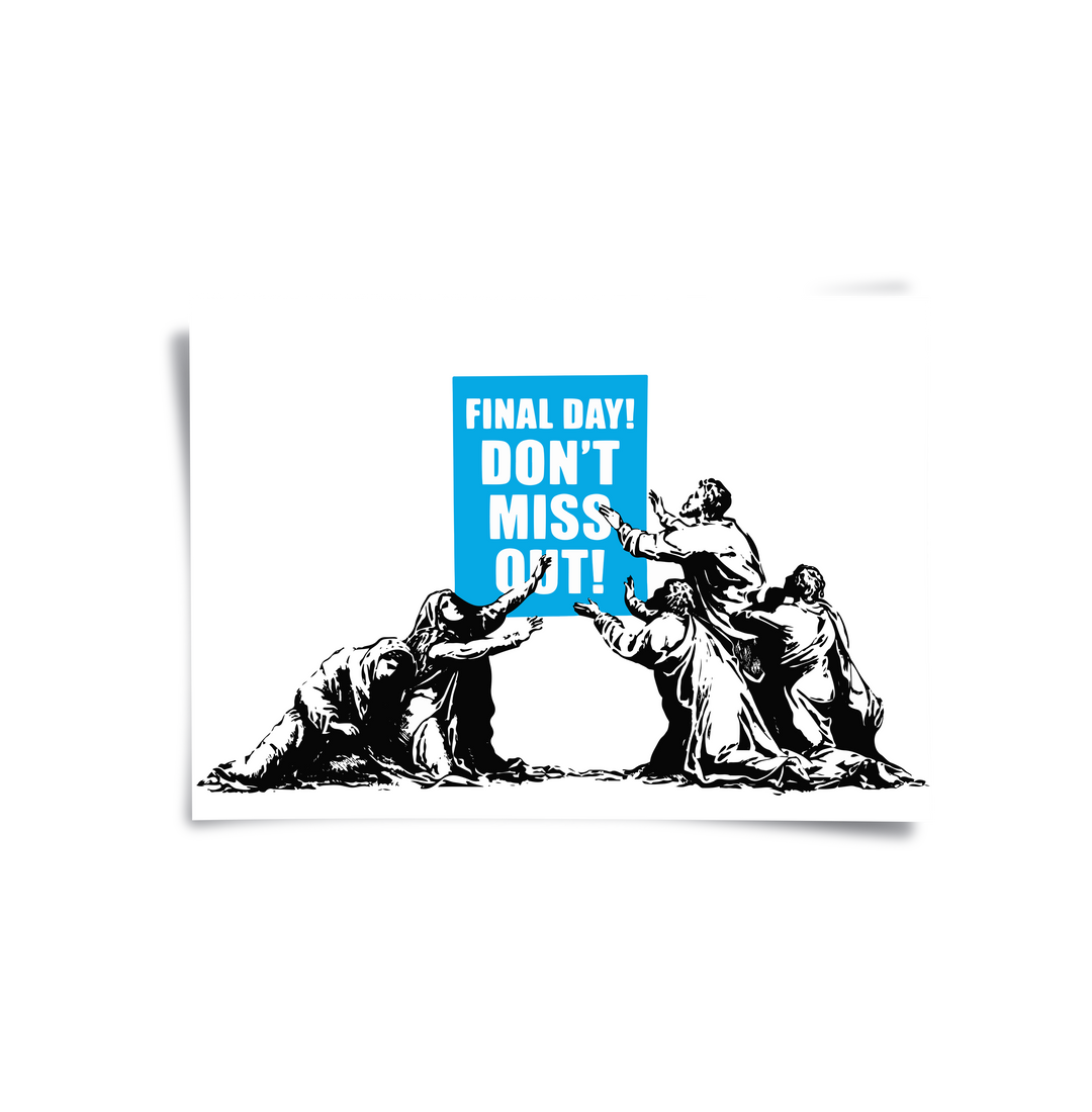 Challenge the modern culture of consumerism with the Final Day! print from Jasmine Art’s Banksy series. This thought-provoking piece juxtaposes classical figures with a vibrant blue "Don’t Miss Out" sale sign, offering a sharp critique on the commercialization of human desire. Its high-contrast monochromatic design with a bold blue accent creates a striking visual narrative. Finished with our signature premium vertical texture, this print provides exceptional tactile depth and a high-end gallery finish. A witty and edgy addition to a modern living room, a creative studio, or a contemporary office in Dubai.