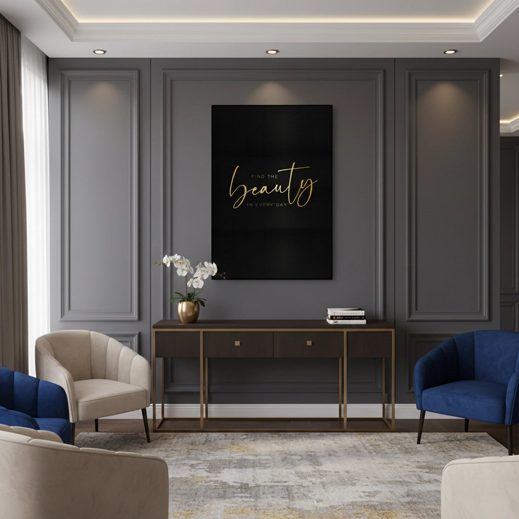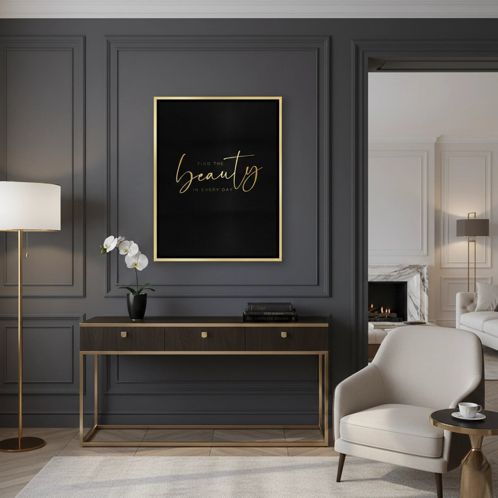 The sophisticated Find the Beauty in Every Day - Gold Script Typography print is an elegant, mindful reminder to appreciate life's details. The central message is highlighted by the word "beauty" rendered in large, luxurious metallic gold flowing script. The surrounding text, "Find the" and "IN EVERY DAY," provides context in a clean gold sans-serif font. This striking gold typography is set against a deep black, textured pinstripe canvas, creating a dramatic, high-contrast, and upscale finish. Ideal for adding a luxurious, reflective, and sophisticated accent to a bedroom, living space, or office in Dubai.