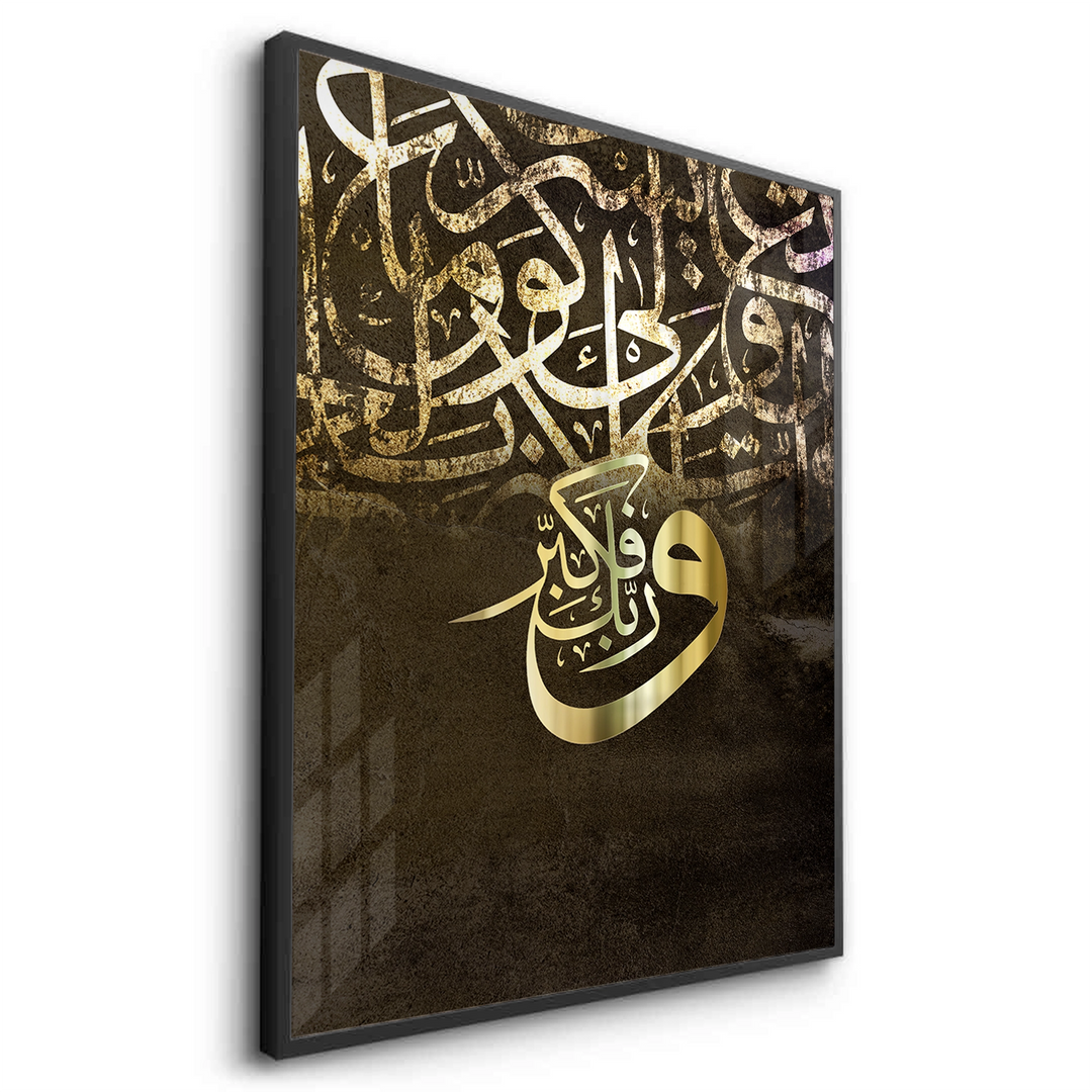 The stunning Floating Arabic Script print is a dramatic and luxurious piece of contemporary Islamic art. The artwork features an opulent contrast between a top section of distressed gold calligraphy patterns and a deep, dark brown lower background. Dominating the centre is a bold, single phrase in metallic gold foil, appearing to float above the textures. This powerful combination is perfect for adding a luxurious, sophisticated, and dramatic cultural statement to a formal reception area or living room in Dubai.
