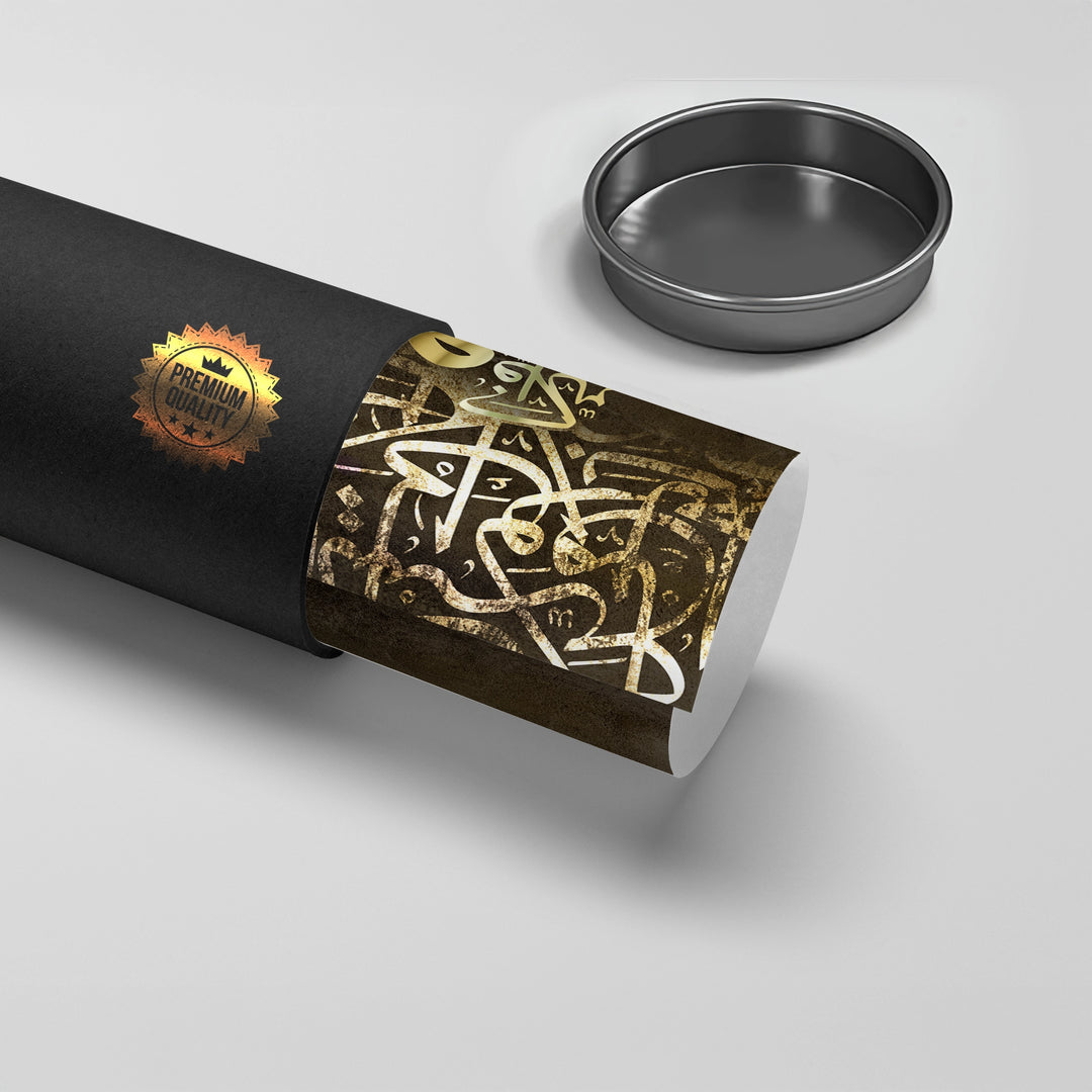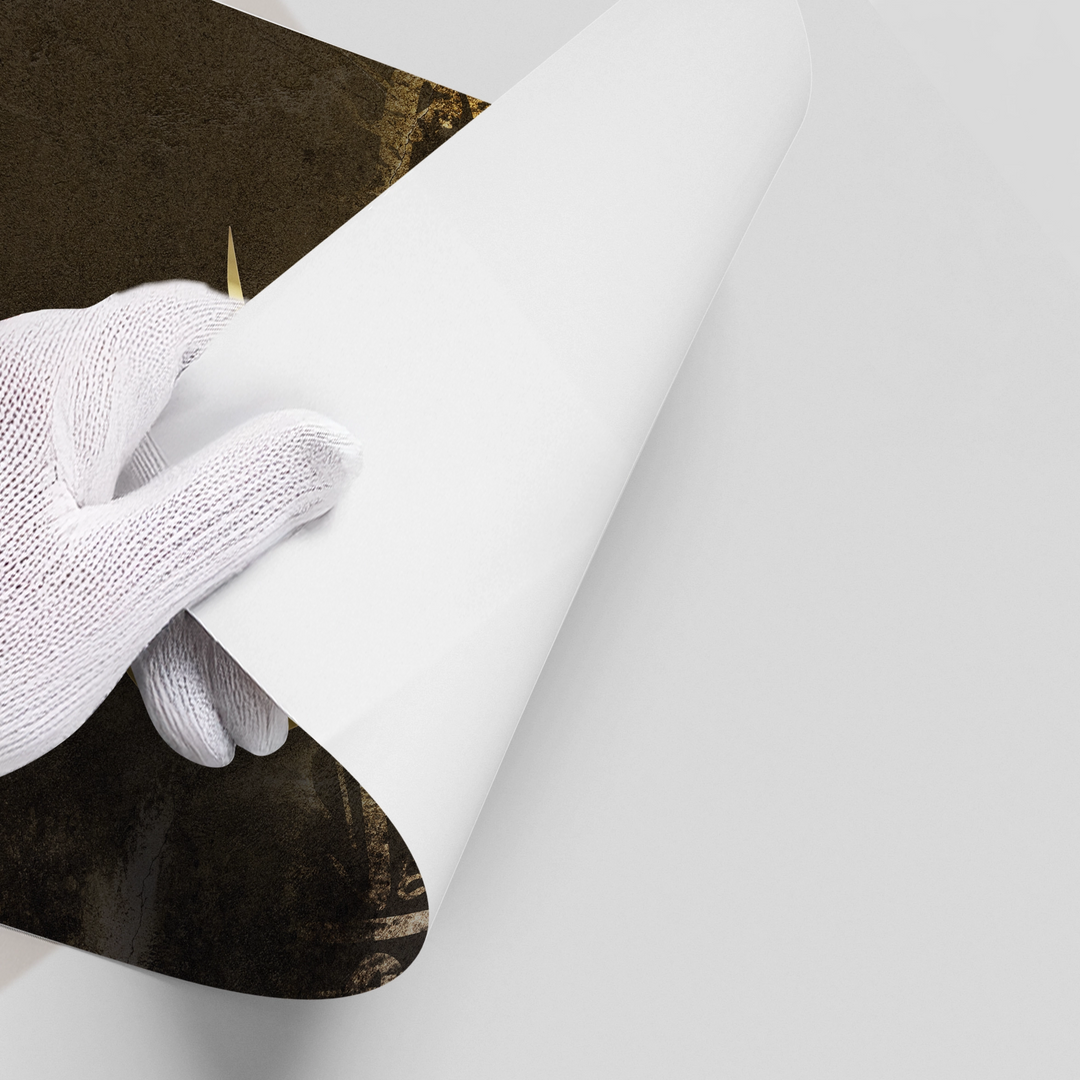 The stunning Floating Arabic Script print is a dramatic and luxurious piece of contemporary Islamic art. The artwork features an opulent contrast between a top section of distressed gold calligraphy patterns and a deep, dark brown lower background. Dominating the centre is a bold, single phrase in metallic gold foil, appearing to float above the textures. This powerful combination is perfect for adding a luxurious, sophisticated, and dramatic cultural statement to a formal reception area or living room in Dubai.