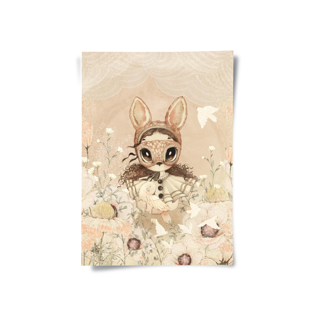 The enchanting Floral Field Fantasy print captures a moment of pure, whimsical storytelling. This intricate artwork features a sweet child wearing a curious fawn-eared hood, standing amongst a dreamlike field of large, soft-hued pastel flowers. Rendered in a sophisticated, vintage-inspired watercolor style, this piece is perfect for inspiring imaginative play and bringing a gentle, fairy-tale charm to a nursery or child’s room in Dubai.