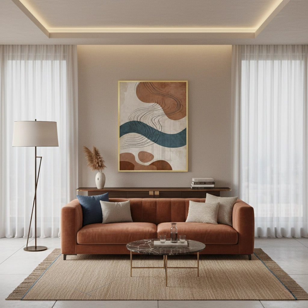 Enhance your sanctuary with the Flowing Lines and Pebbled Shapes from Jasmine Art’s Bohemian series. This sophisticated abstract print features rhythmic wavy lines and smooth organic forms in a grounding palette of terracotta, slate blue, and warm beige. Its minimalist yet expressive design creates a calm, contemporary atmosphere that speaks of natural elegance. Finished with our signature premium vertical texture, this print offers exceptional tactile depth and a high-end gallery finish. A perfect statement piece for a modern living room, a serene bedroom, or an executive office in Dubai.