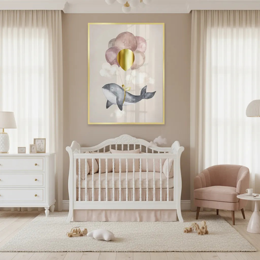 The imaginative and fantastical Flying Whale print inspires limitless creativity and deep-sea dreams. This unique piece is perfect for an adventurous boy's room or a nautical-themed nursery in the UAE.