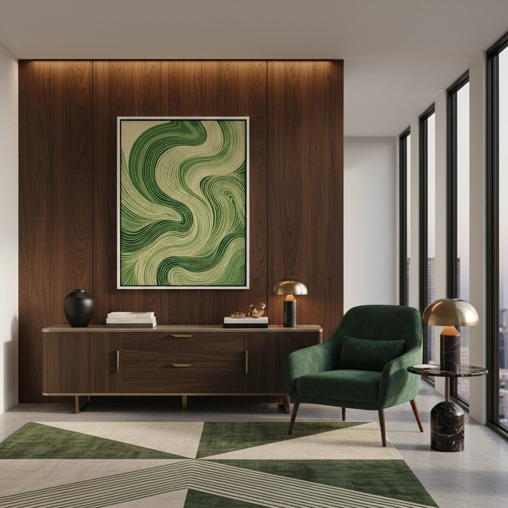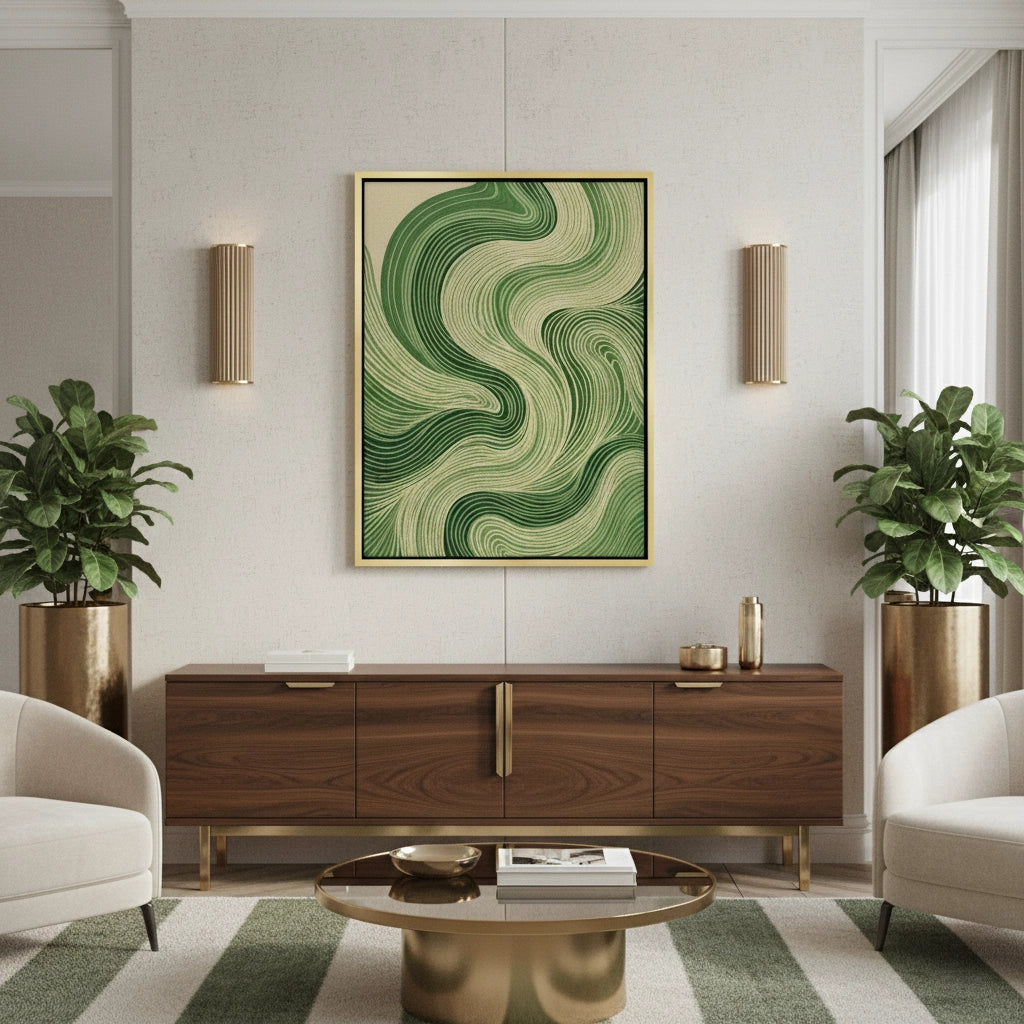 Connect with the rhythm of nature through Forest Meanders from Jasmine Art. This abstract masterpiece features flowing topographical lines in shades of emerald and forest green, mimicking the serene movement of a woodland stream. The hypnotic design brings a sense of calm and infinite growth to any modern interior. Finished with our signature premium fine-ribbed texture, this print offers exceptional tactile depth and a high-end gallery finish. A tranquil statement piece for a minimalist living room, a zen bedroom, or a luxury spa in Dubai.