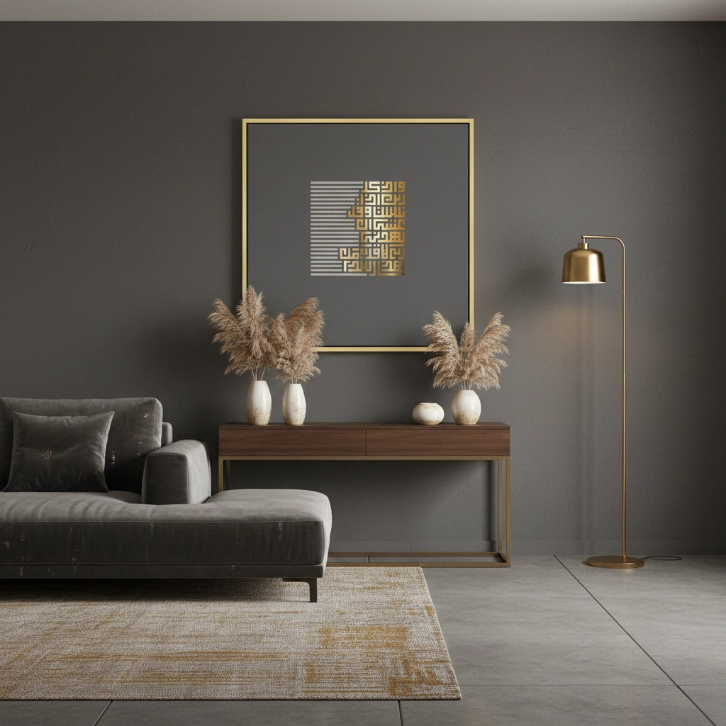 Embrace the harmony of tradition and technology with the Geometric Kufic Calligraphy from Jasmine Art’s Arabic Calligraphy collection. This innovative piece features sacred script emerging from a series of precise linear patterns, rendered in a radiant metallic gold finish. The sophisticated slate grey backdrop provides a calm, contemporary stage for this spiritual geometry. Finished with our signature premium fine-dot texture, this print offers exceptional tactile depth and a high-end gallery finish. An ideal intellectual accent for a modern office, a minimalist study, or a luxury apartment in Dubai.