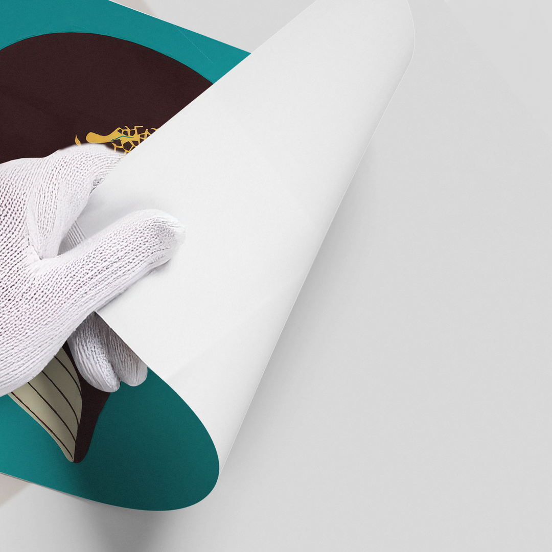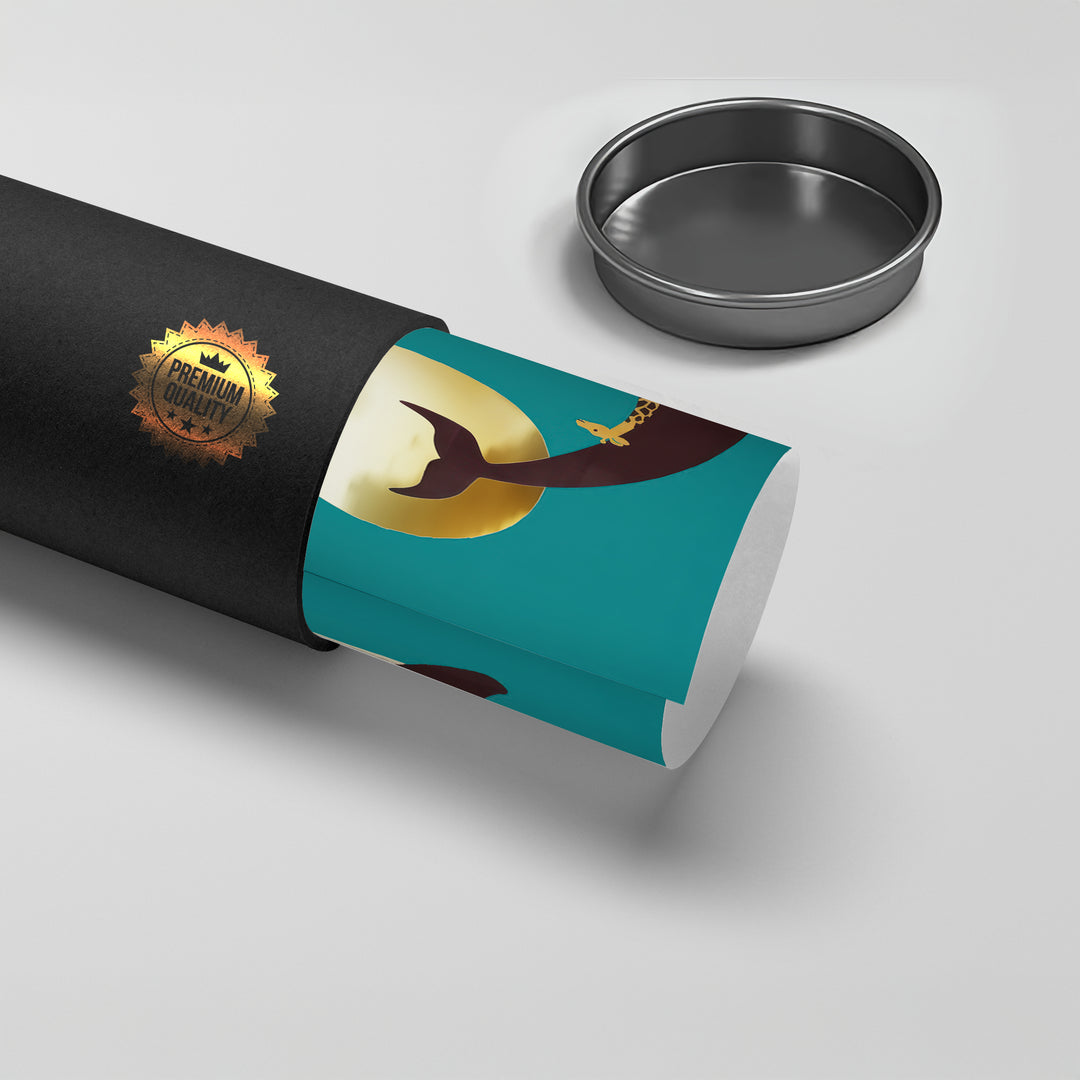 The truly magical Giraffe Riding Whale print is a captivating piece of imaginative art for a child's space. This canvas features an endearing giraffe riding on the back of a whale, set against a vibrant teal background and crowned by a shimmering metallic gold sun/moon. It's a whimsical statement that inspires creativity and adds a touch of luxurious fantasy to any nursery or playroom in Dubai.