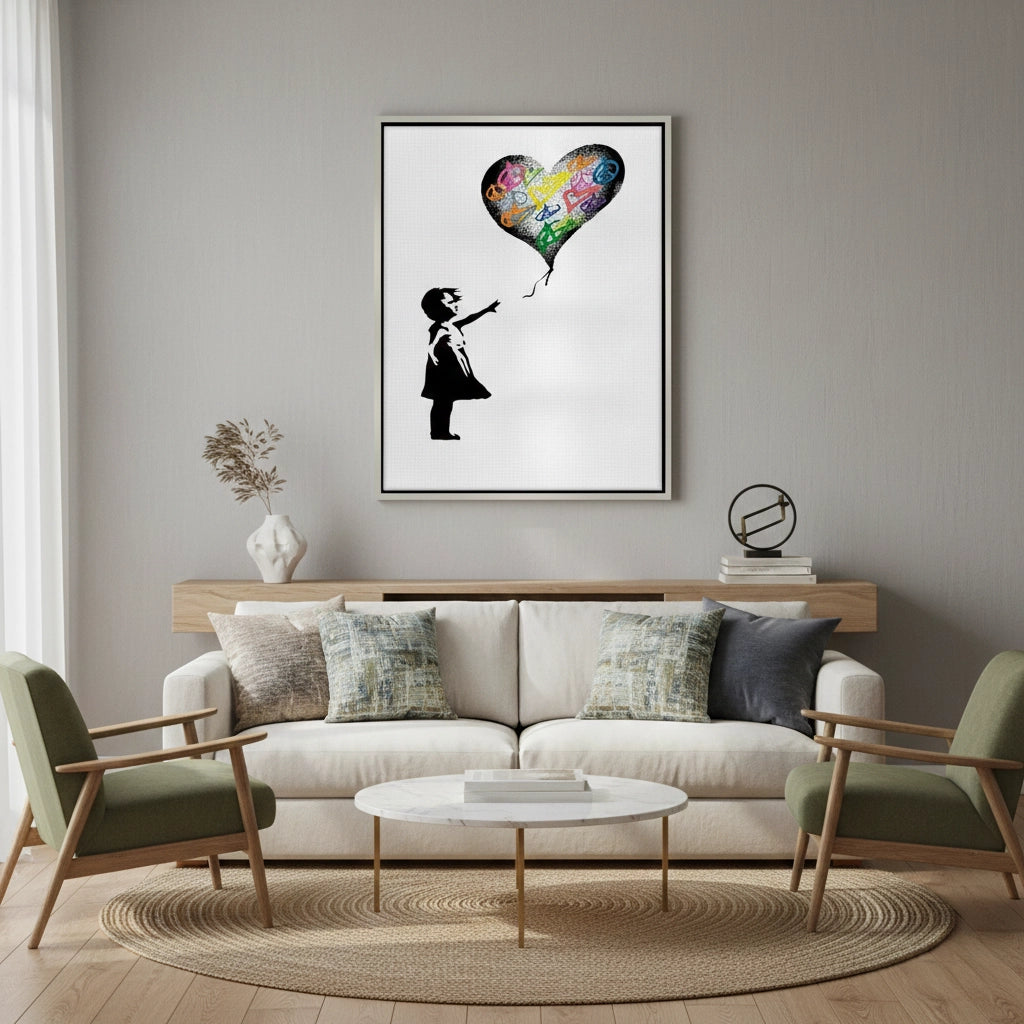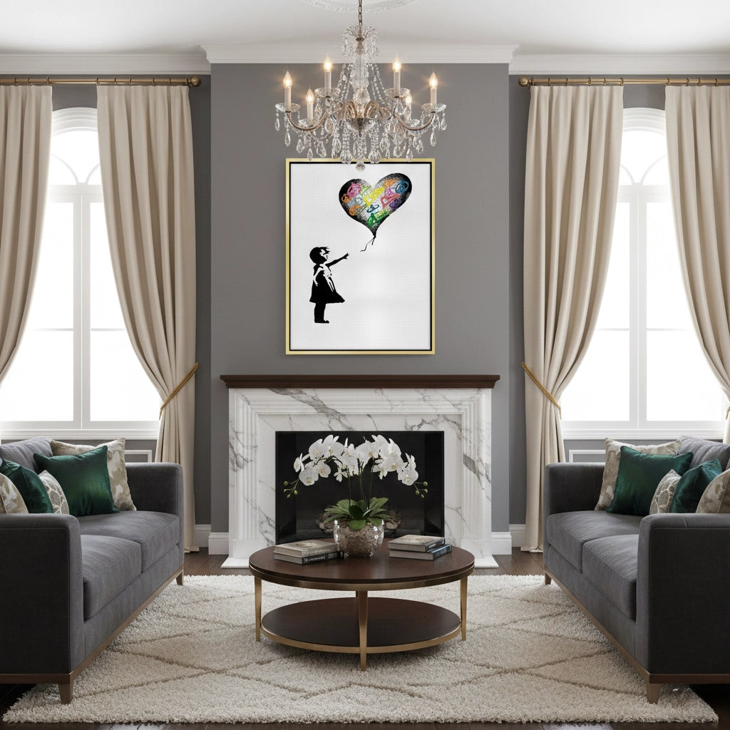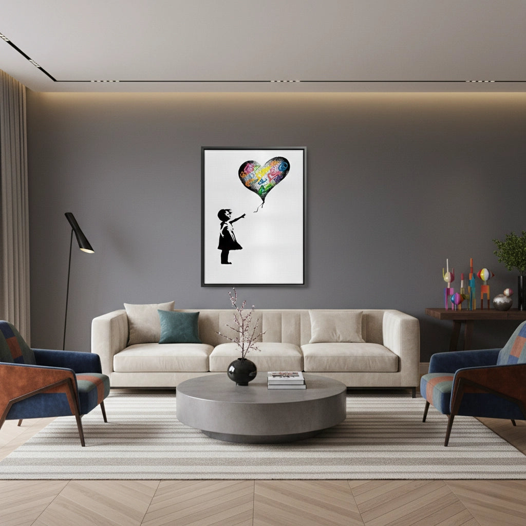 Spread a message of harmony with the Girl Reaching for Peace Heart Balloon from Jasmine Art’s Banksy series. This poignant artwork features a girl reaching for a heart-shaped balloon filled with vibrant peace symbols, reimagining an iconic motif with a soulful twist. The striking contrast of the black silhouette against colorful symbols creates a powerful visual of hope and love. Finished with our signature premium vertical texture, this print offers exceptional tactile depth and a high-end gallery finish. A perfect meaningful addition for a modern nursery, a creative living space, or a gallery wall in Dubai.
