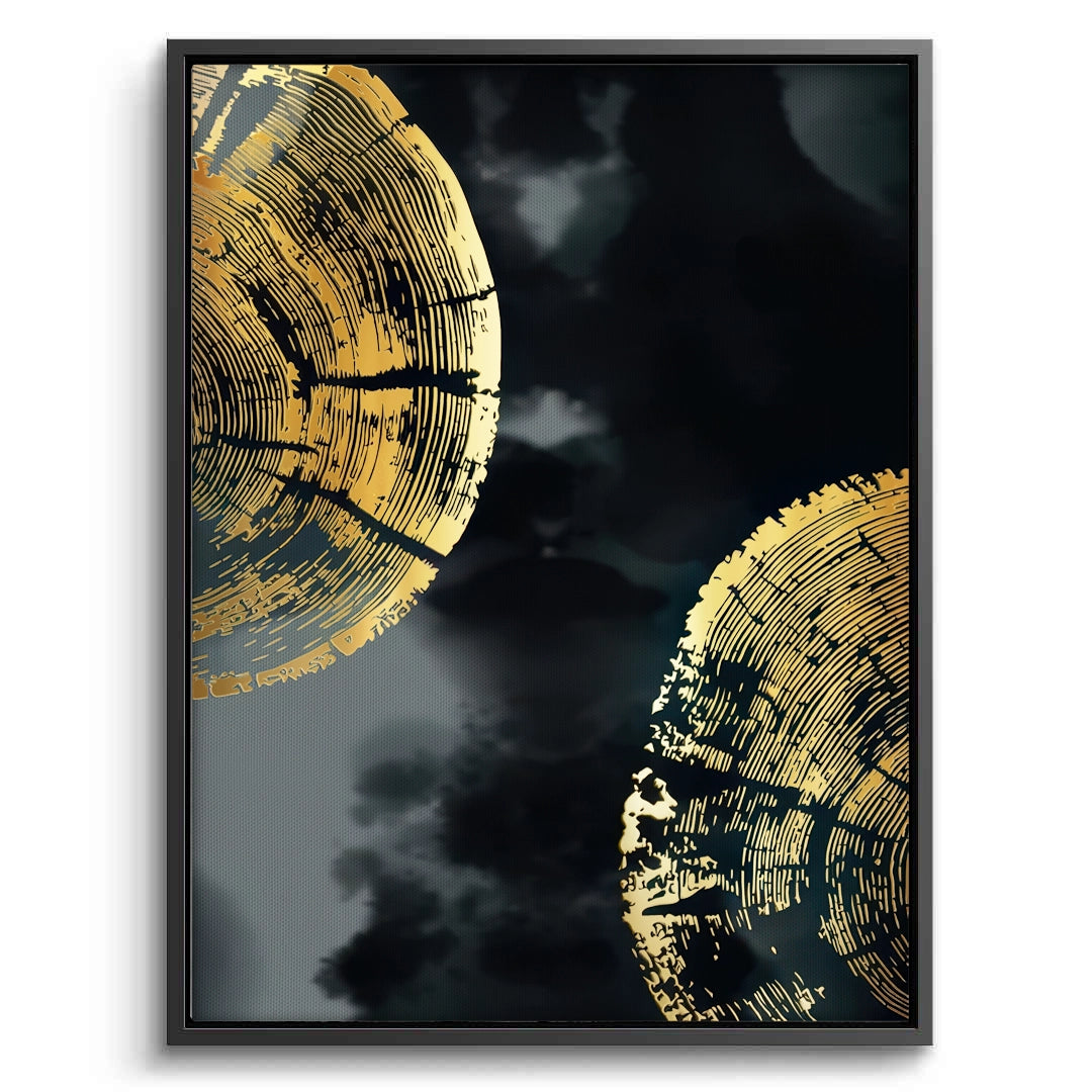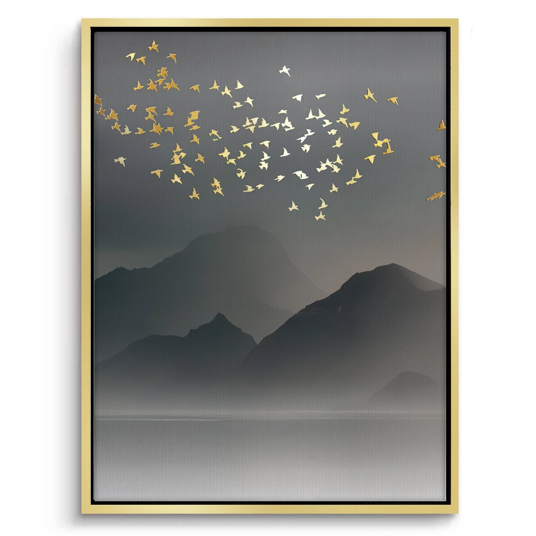 The dramatic Gold Birds and Tree Ring Set of 2 merges moody landscapes with abstract luxury. This Monochrome Nature Set features two unique but coordinating pieces: <ul><li>Panel 1: A serene, misty grey mountain landscape with a flock of shimmering gold birds.</li><li>Panel 2: Two highly detailed gold-foil tree cross-sections set against a swirling abstract dark grey background.</li></ul> The rich combination of black, grey, and vibrant gold creates a sophisticated, opulent, and contemporary nature statement. Perfect for adding luxe drama to a master bedroom or living space in Dubai.