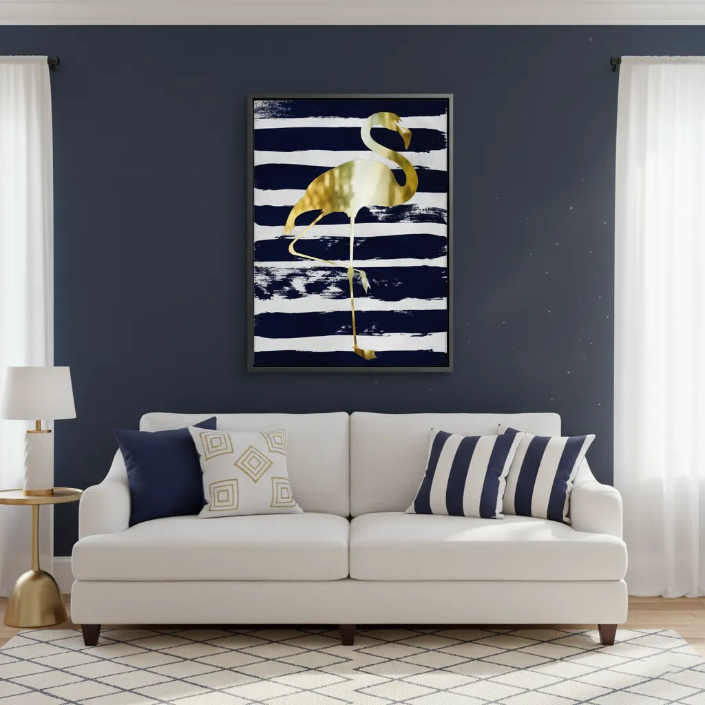 This piece is a vibrant celebration of bold color contrast. An elegant pink flamingo, accented with subtle gold, stands out against a dramatic, deep navy blue background. It’s a playful yet luxurious statement piece perfect for a modern bathroom or bar area.