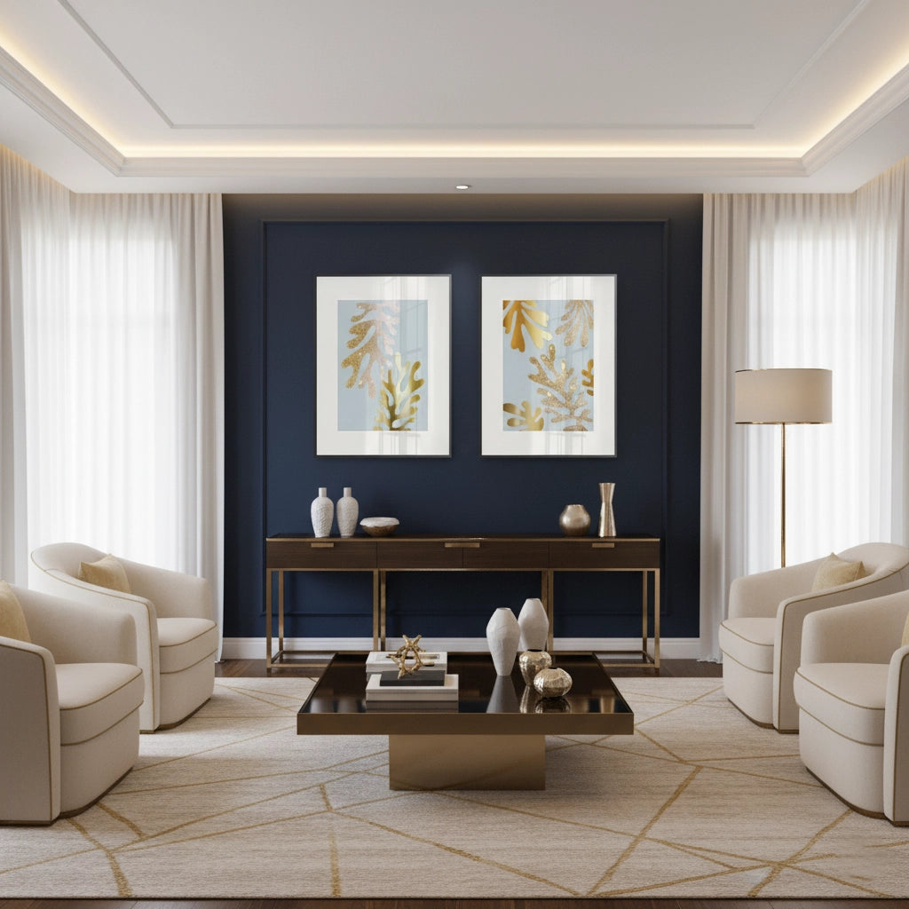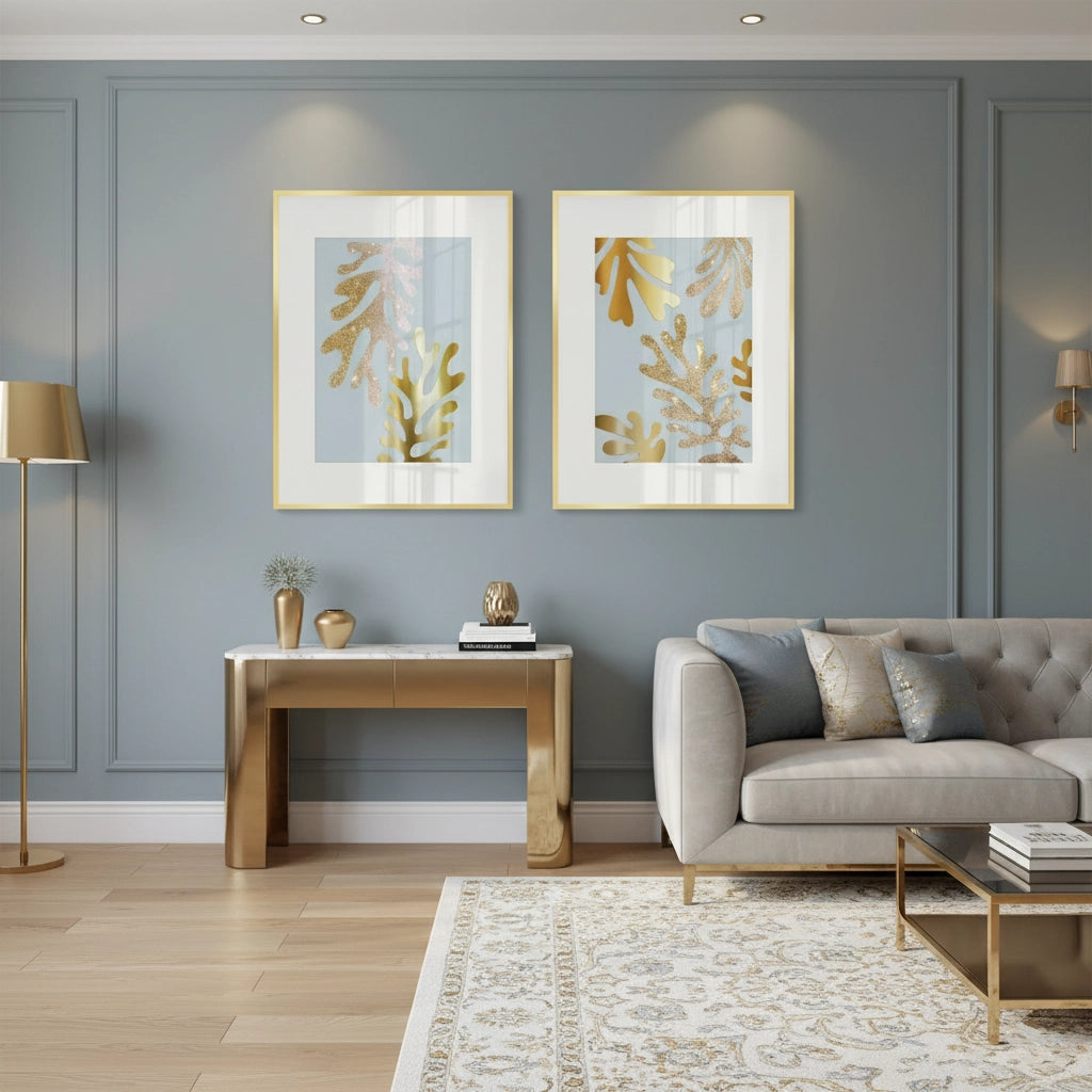 The dazzling Gold Glitter Abstract Leaves Set of 2 offers a modern, luxurious take on botanical forms. This pair of artworks features abstract, stylized leaf shapes rendered in shimmering metallic gold foil and sparkling gold glitter. Set against a calm pale blue/grey background with a crisp white border, the contrasting textures and hues create a sophisticated focal point. This set is perfect for injecting coastal glam, modern elegance, and eye-catching luxury into a hallway, living room, or master suite in Dubai.