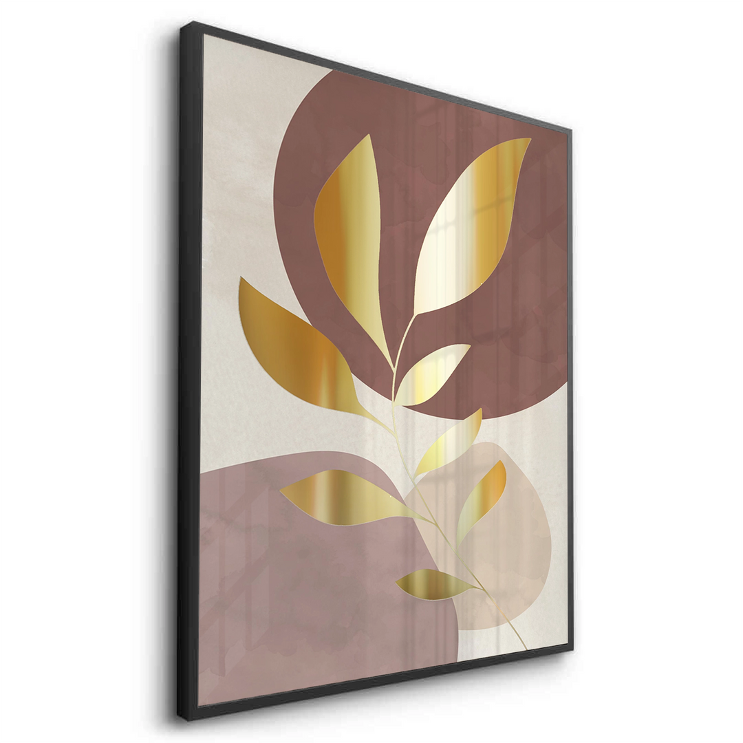 The sophisticated Gold Leaf Abstract print is a striking piece of minimalist botanical luxury. This canvas features delicate, stylized leaves rendered entirely in brilliant metallic gold foil. These organic shapes are set against a modern backdrop of soft, abstract mauve and neutral circles, creating depth and contemporary appeal. This piece offers a touch of gilded elegance and artistic flair, perfect for adding warmth and sophistication to any living area or corporate space in Dubai.