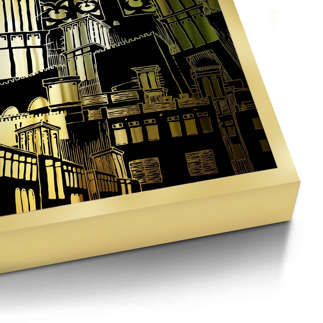 The majestic Golden Heritage - Architectural Gold Line Art print is a luxurious celebration of Middle Eastern history and design. This intricate piece features a highly detailed sketch of traditional heritage buildings, including iconic wind towers (Barjeel) and ornate arched windows. The entire scene is rendered in shimmering metallic gold lines that glow against a deep black, textured pinstripe canvas. The high-contrast design highlights the complex beauty of historical architecture, from the delicate patterns to the densely layered structures. It is an ideal statement piece for adding cultural depth, sophisticated luxury, and a touch of gold to a formal majlis, executive office, or modern living room in Dubai.