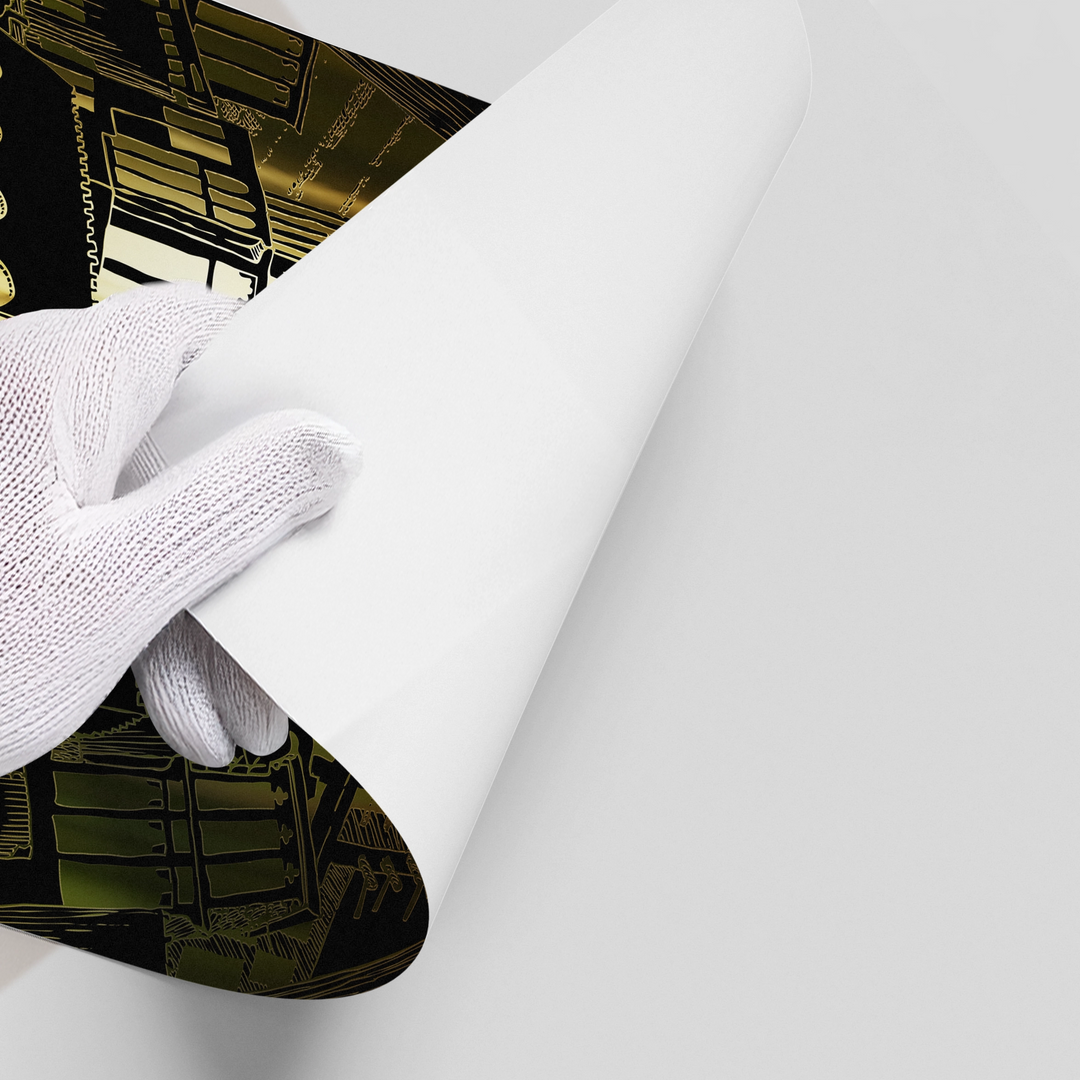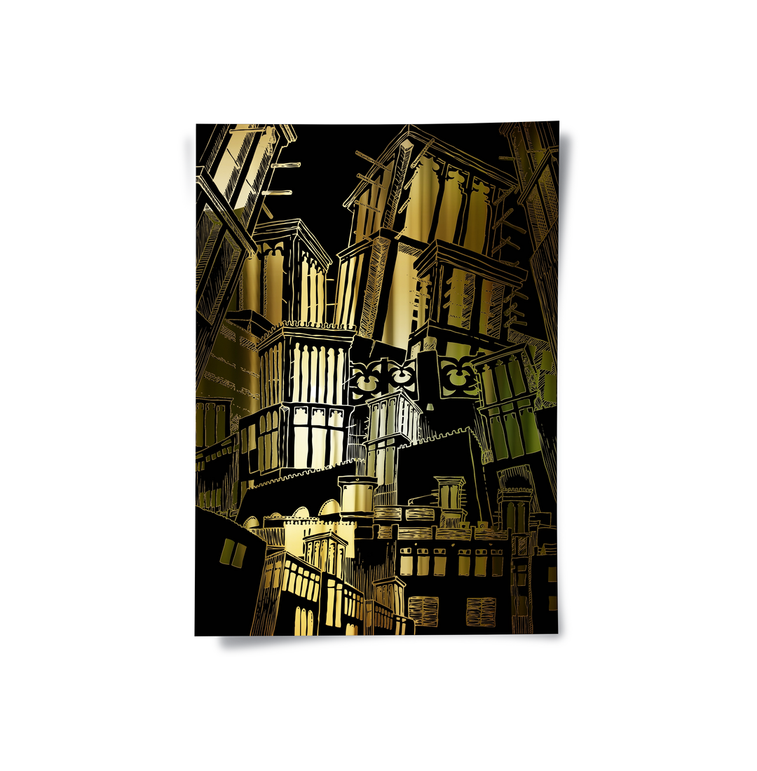 The majestic Golden Heritage - Architectural Gold Line Art print is a luxurious celebration of Middle Eastern history and design. This intricate piece features a highly detailed sketch of traditional heritage buildings, including iconic wind towers (Barjeel) and ornate arched windows. The entire scene is rendered in shimmering metallic gold lines that glow against a deep black, textured pinstripe canvas. The high-contrast design highlights the complex beauty of historical architecture, from the delicate patterns to the densely layered structures. It is an ideal statement piece for adding cultural depth, sophisticated luxury, and a touch of gold to a formal majlis, executive office, or modern living room in Dubai.