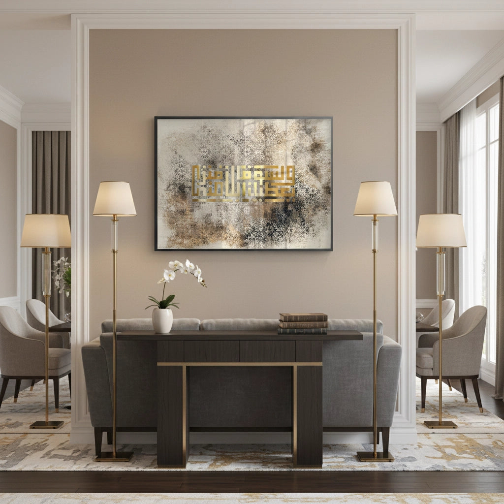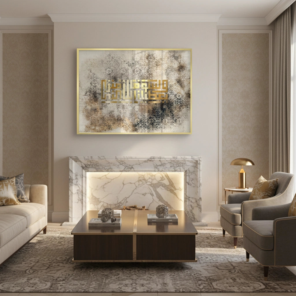 The sophisticated Golden Kufic Calligraphy - Geometric Clarity print is a striking example of modern Islamic geometric design. The central focus is the script, rendered in bold, reflective metallic gold Square Kufic calligraphy, known for its architectural precision and minimalist elegance. This precise geometric form is beautifully contrasted against a richly textured, distressed background featuring subtle beige, brown, and grey tones, embedded with faded traditional Islamic patterns. Ideal for adding a minimalist, profound, and luxurious geometric statement to a modern office or living room in Dubai.