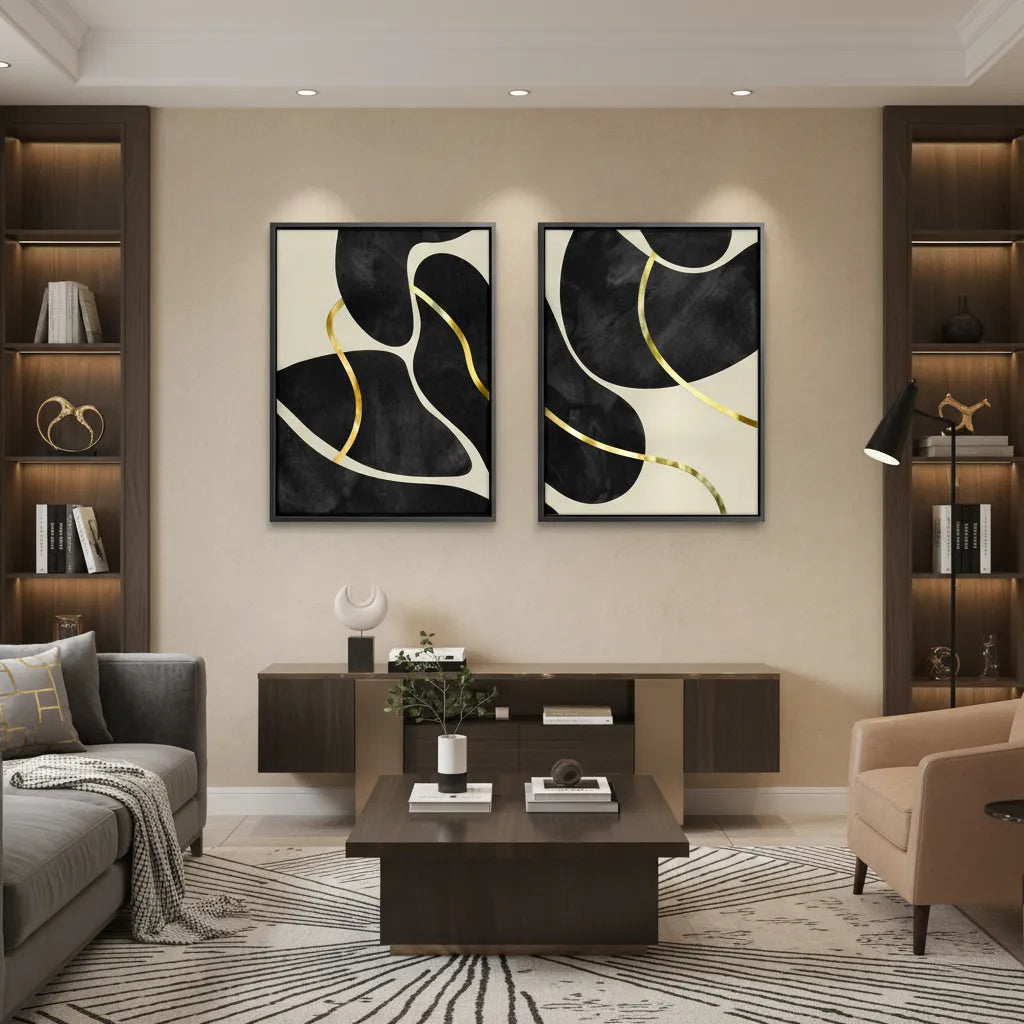 The Golden Meander Set of 2 features smooth, refined lines accented with subtle gold leaf. This minimalist art style promotes a sense of calm and fluidity, ensuring a clean, uncluttered look while the golden texture adds a necessary touch of luxury. It is ideal for connecting spaces or adding elegance to a narrow wall.