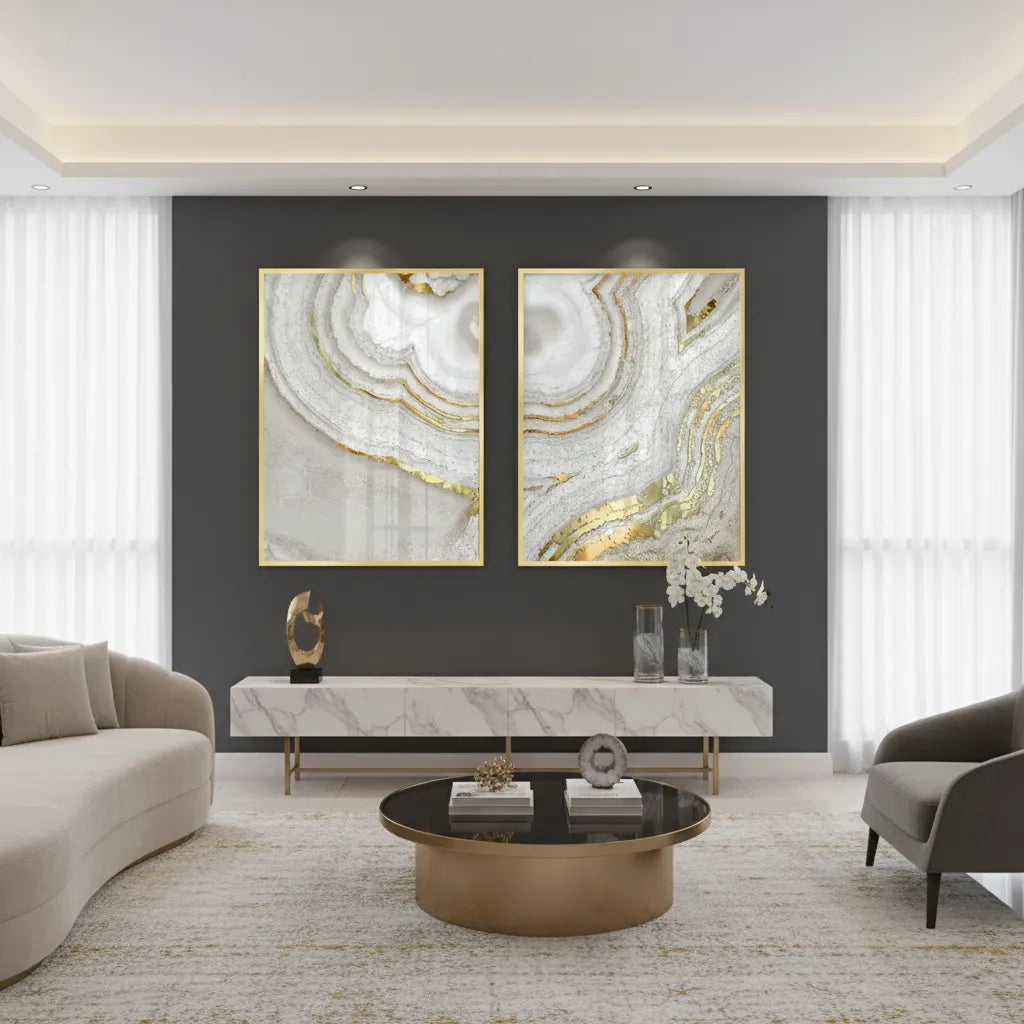 This stunning duo blends the aesthetics of raw, crystalline minerals with soft, shimmering gold accents. The subtle texture and earth tones ensure the set maintains a balanced and sophisticated look, making it a versatile choice for any room seeking modern equilibrium and refined detail.