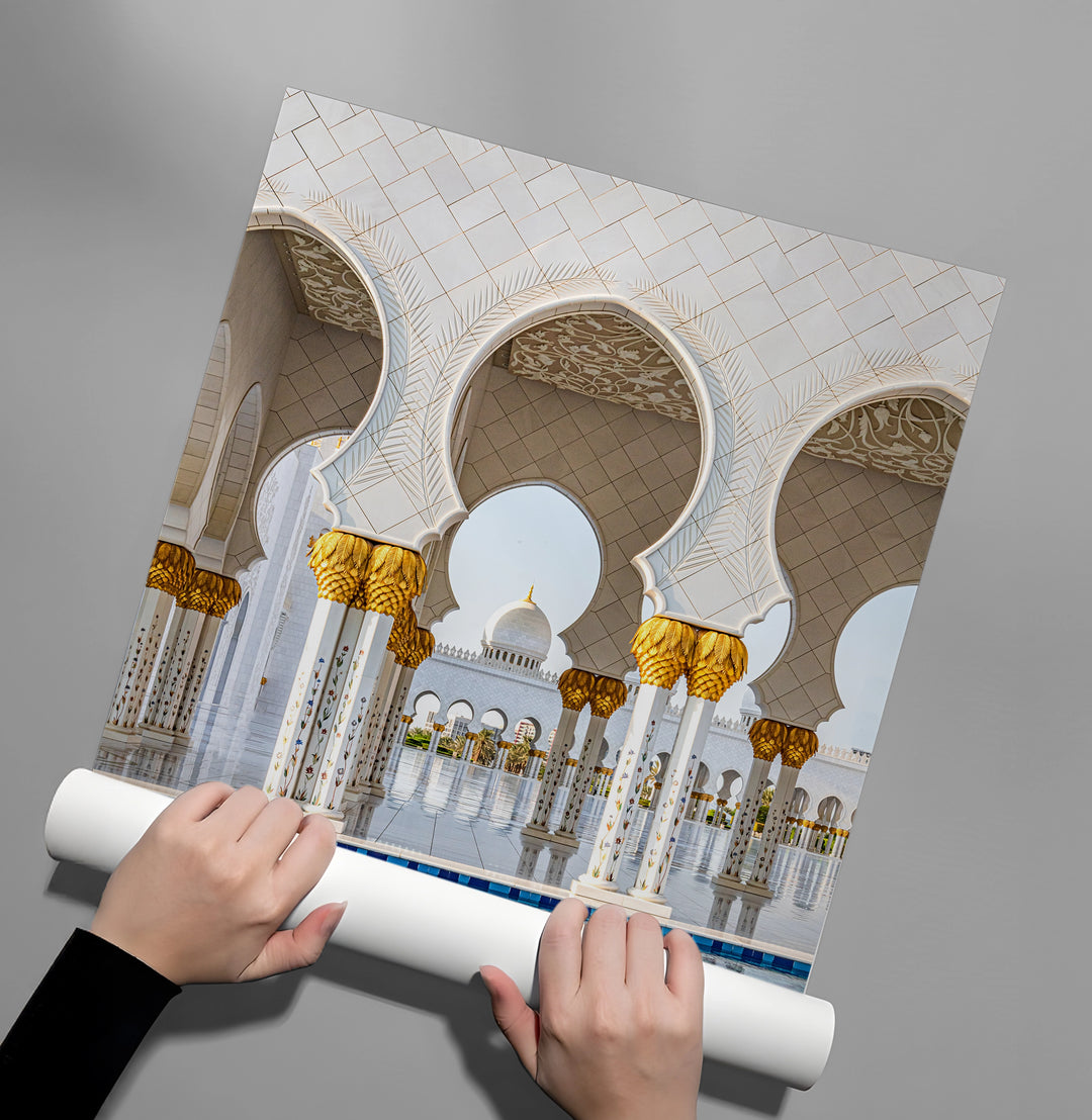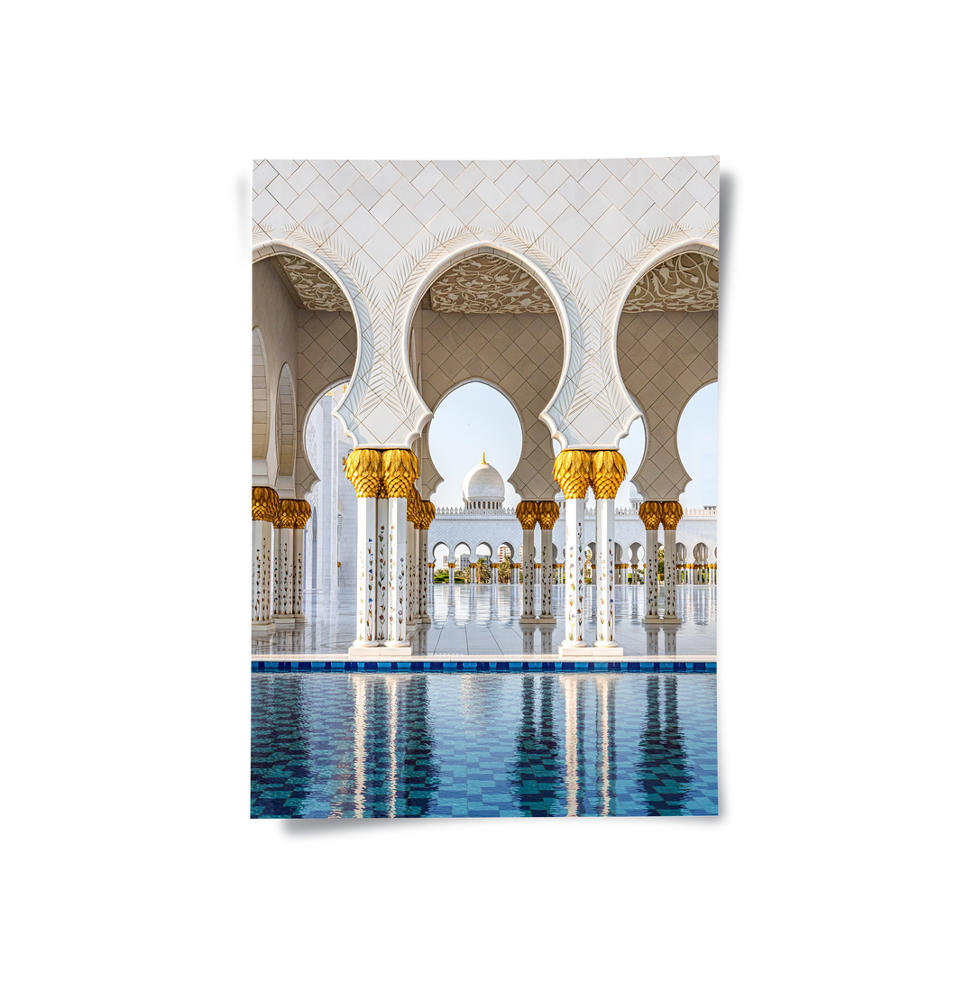 Immerse yourself in the regal splendor of Abu Dhabi with the Golden Serenity art print. This breathtaking photograph captures the iconic white marble columns and golden date-palm capitals of the Sheikh Zayed Grand Mosque, reflected beautifully in the surrounding turquoise pools. The intricate floral mosaics and majestic arches create a scene of divine harmony and architectural brilliance. Finished with our signature premium vertical texture, this print offers a luxurious tactile finish that radiates light and opulence. A profound statement piece for a grand entrance, a serene living room, or a luxury office in Dubai.