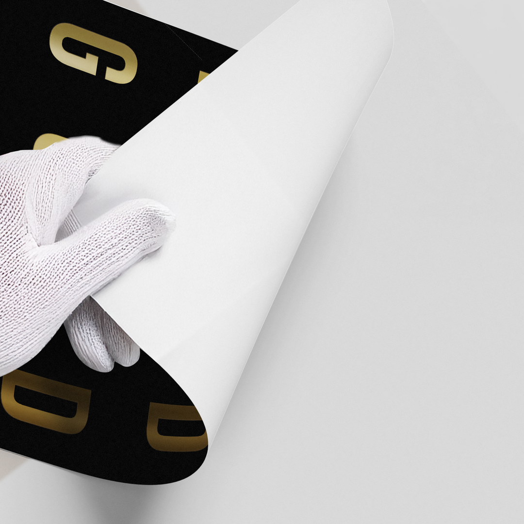 The chic Good Food Good Mood - Gold Kitchen Typography print is a stylish reminder of the connection between great food and happiness. The simple yet powerful statement "GOOD FOOD GOOD MOOD" is presented in bold, large metallic gold sans-serif typography. The letters are arranged in a clean, contemporary vertical grid pattern, ensuring a modern and structured look. This radiant gold text creates a striking contrast against the deep black, textured pinstripe canvas. Ideal for adding a luxurious, sophisticated, and inviting accent to a kitchen, dining area, or coffee station in Dubai.