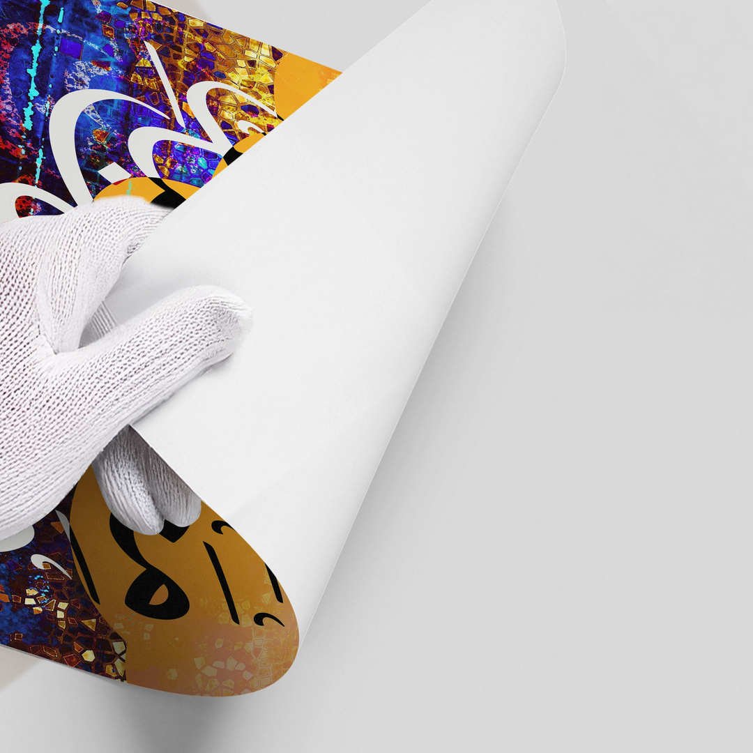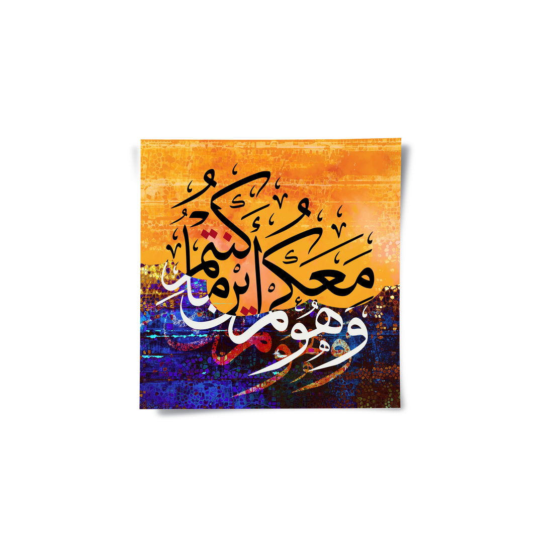 Experience divine companionship with He is With You from Jasmine Art’s Arabic Calligraphy collection. This masterpiece renders the powerful verse "Wa Huwa Ma'akum" in bold Thuluth script over a mesmerizing mosaic of sunset orange and deep indigo. The vibrant color transition symbolizes God’s presence through every phase of life. Finished with our signature premium mosaic-grain texture, this print offers exceptional tactile depth and a high-end gallery finish. A stunning, soulful statement piece for a contemporary living room, a creative studio, or a modern office in Dubai.