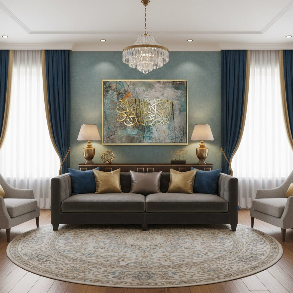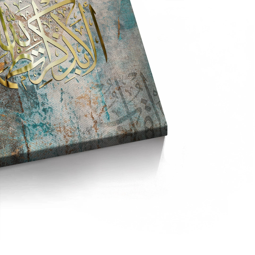 Find ultimate peace with the Serenity in Remembrance from Jasmine Art’s Arabic Calligraphy collection. This striking piece features the sacred verse "Ala Bizikrillahi Tatma’innul Qulub" rendered in a radiant metallic gold script against a contemporary teal and grey abstract backdrop. The blend of traditional calligraphy with modern artistic strokes creates a powerful spiritual anchor for any space. Finished with our signature premium grain texture, this print offers exceptional tactile depth and a luxury gallery finish. An ideal healing statement piece for a bedroom, a peaceful reading corner, or a modern office in Dubai.