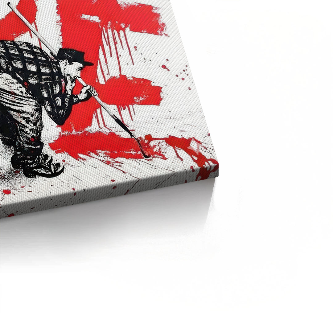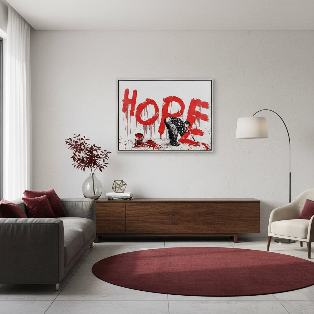 Make a profound statement with the Hope Painter art print from Jasmine Art’s Banksy-inspired collection. This powerful piece features a detailed stencil of a painter cleaning red spills beneath a massive, dripping "HOPE" mural. The stark contrast between the intricate black-and-white figure and the bold red typography creates a visually arresting and thought-provoking focal point. Finished with our signature premium vertical texture, this print elevates raw urban activism into a luxury gallery-quality masterpiece. An ideal conversation piece for a modern office, creative studio, or industrial-style living room in Dubai.