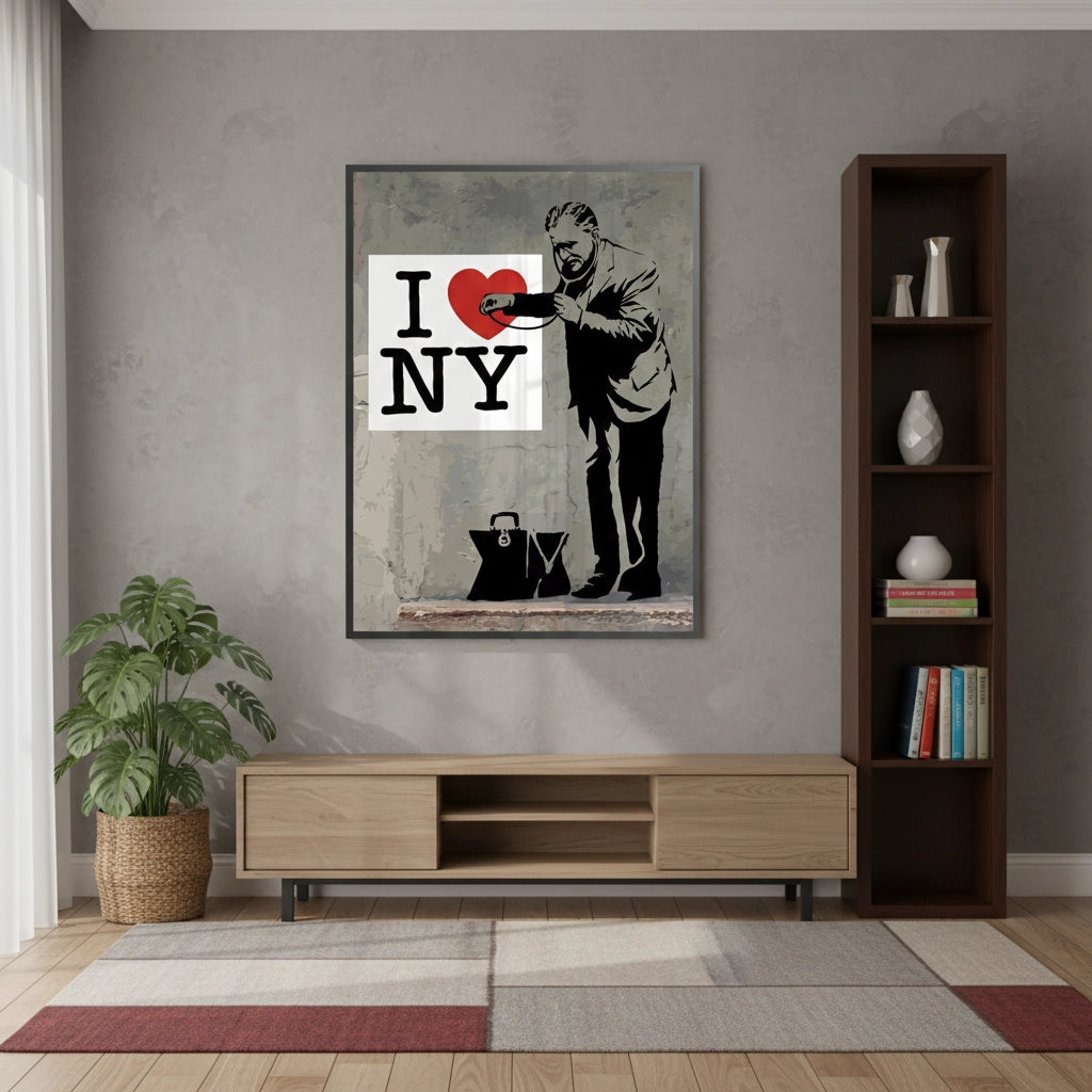 Add a layer of intellectual wit to your decor with the I Love NY Doctor art print from Jasmine Art’s Banksy-inspired collection. This iconic piece depicts a stencil-style doctor examining the pulse of the legendary "I ❤️ NY" logo, making a powerful statement on urban life and cultural health. The striking contrast of the vibrant red heart against the gritty grey background creates a captivating focal point. Finished with our signature premium vertical texture, this print elevates raw street art into a luxury gallery-quality masterpiece. A perfect conversation starter for a modern living room, a creative studio, or an edgy office in Dubai.