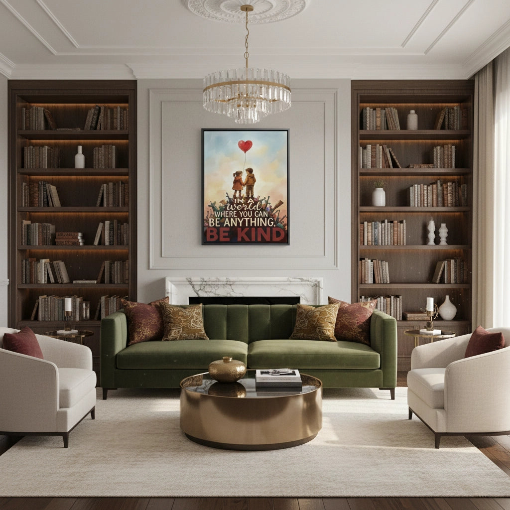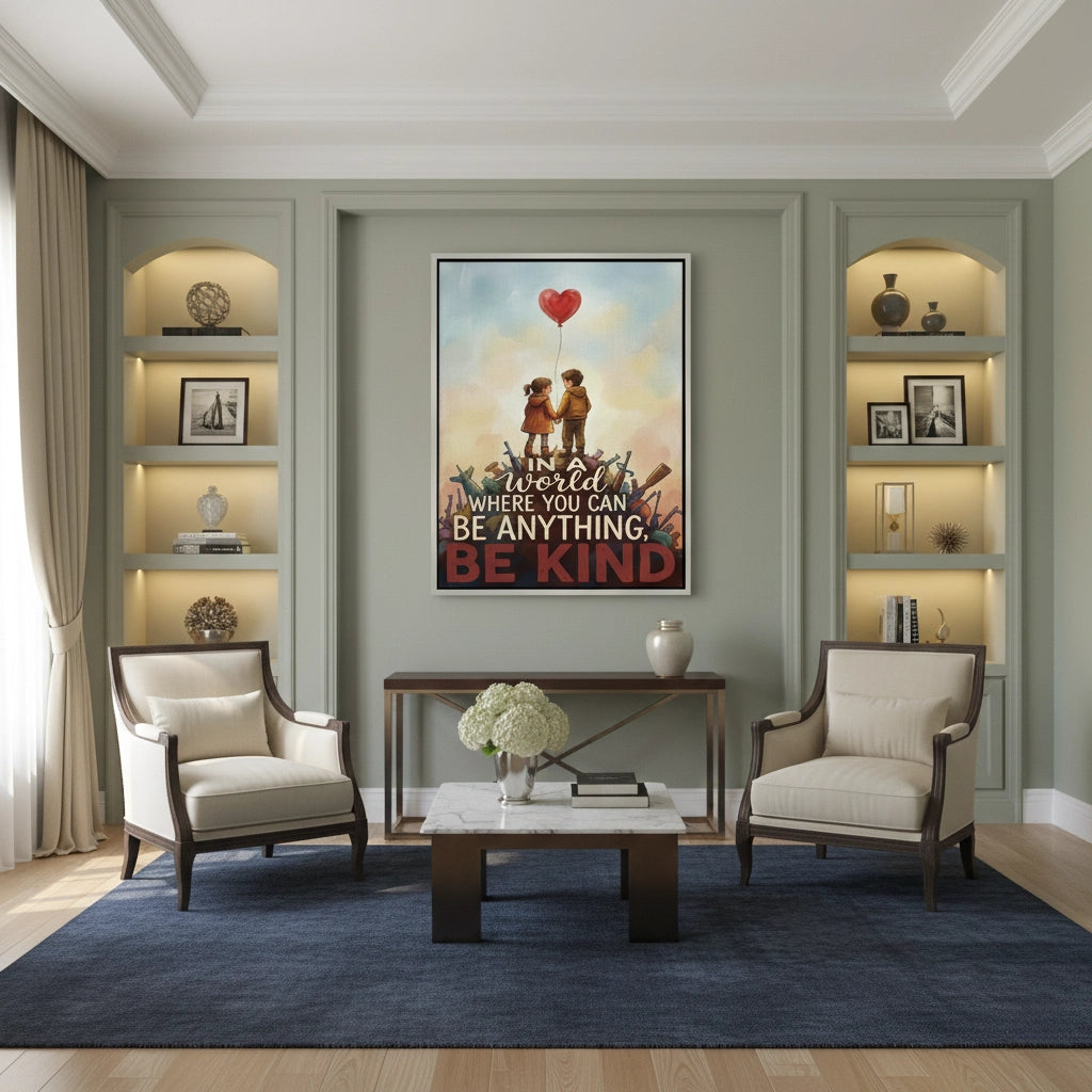 Inspire your home with the powerful message of the "Be Kind" artwork from Jasmine Art’s Banksy series. This poignant piece features two children holding a red heart balloon atop a mound of rubble, symbolizing hope and humanity in challenging times. The iconic quote serves as a daily reminder of the power of compassion. Finished with our signature premium vertical texture, this print offers exceptional tactile depth and a high-end gallery finish. A perfect heart-warming addition for a family living room, a child's nursery, or a modern office in Dubai.