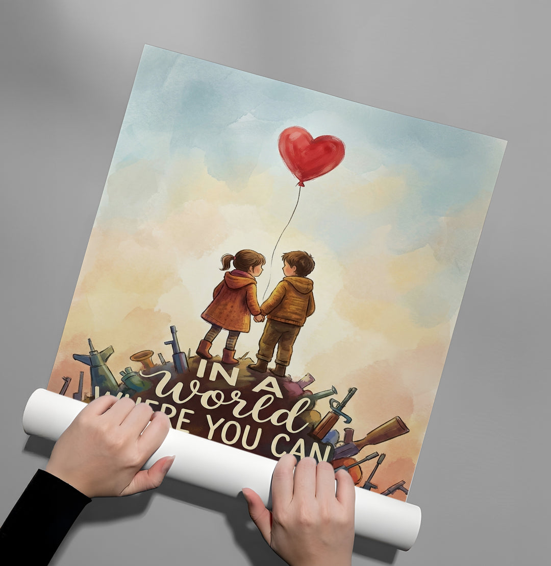 Inspire your home with the powerful message of the "Be Kind" artwork from Jasmine Art’s Banksy series. This poignant piece features two children holding a red heart balloon atop a mound of rubble, symbolizing hope and humanity in challenging times. The iconic quote serves as a daily reminder of the power of compassion. Finished with our signature premium vertical texture, this print offers exceptional tactile depth and a high-end gallery finish. A perfect heart-warming addition for a family living room, a child's nursery, or a modern office in Dubai.