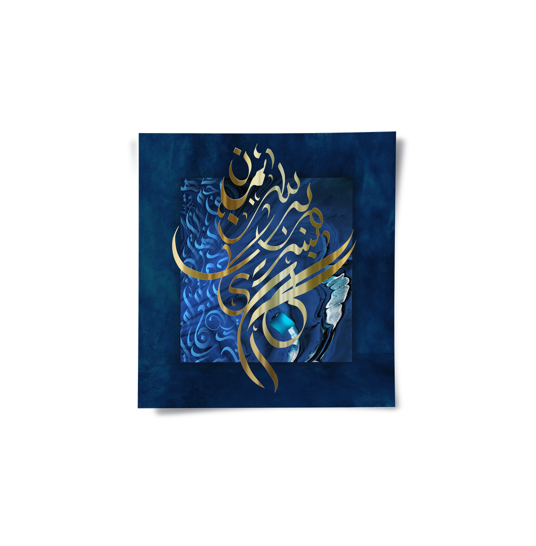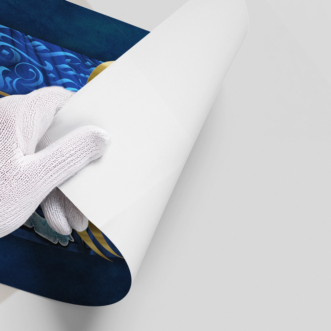 The majestic Blue & Gold Ayat - Divine Majesty print is a rich expression of spiritual opulence, perfectly embodying the phrase "In the name of God, the Most Gracious". It features intricate, flowing metallic gold Arabic calligraphy, likely the beginning of Ayat al-Kursi, concentrated in a luminous teardrop shape. The calligraphy is set against a luxurious, deep sapphire blue, textured canvas, framed by sweeping gold filigree. This piece is a powerful blend of traditional Islamic elegance and contemporary luxury. Ideal for adding a regal, spiritually profound focal point to a home or majlis in Dubai.