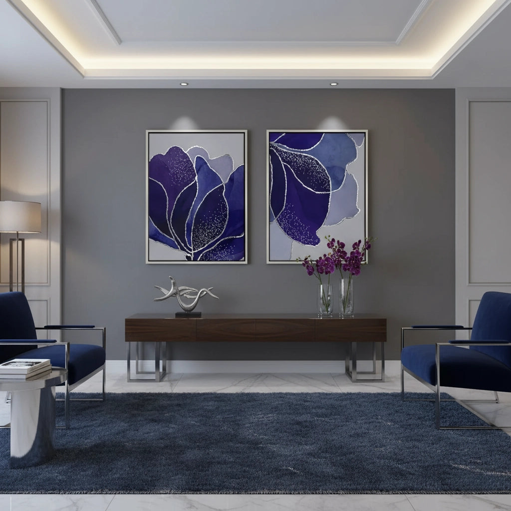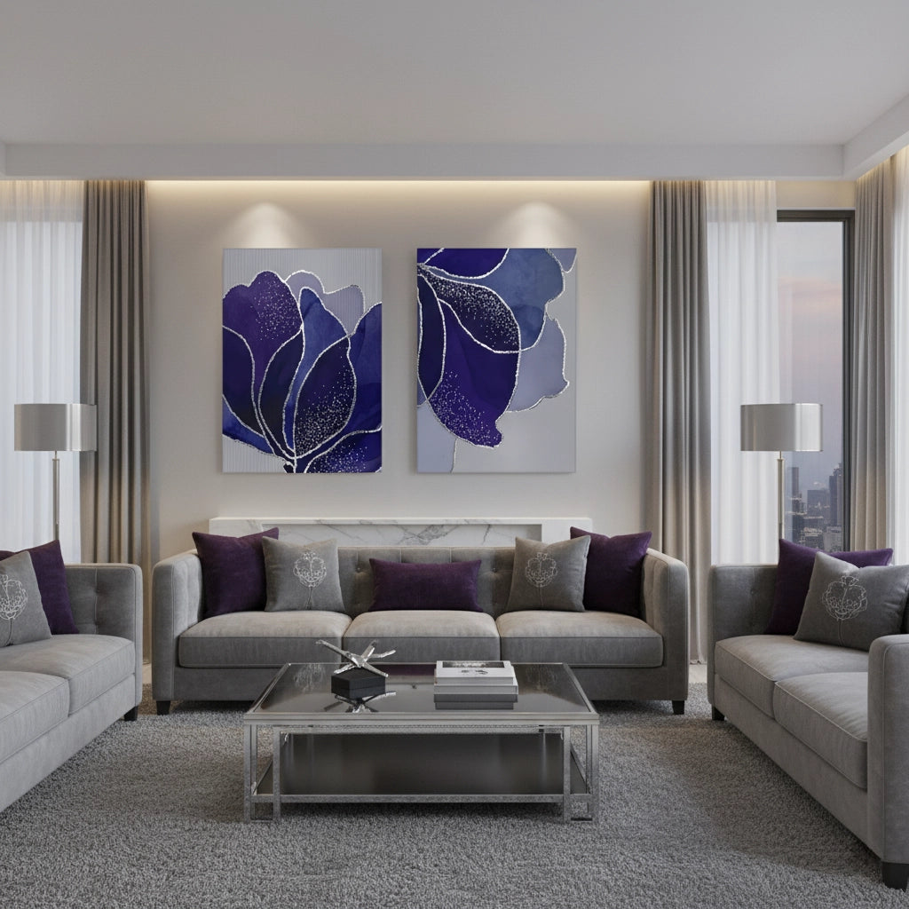 The luxurious Indigo Sparkle Floral Set of 2 is a breathtaking statement piece for a sophisticated modern interior. This stunning diptych features oversized floral abstracts in rich indigo and deep purple watercolors, dramatically highlighted with shimmering metallic silver foil accents. This artwork offers profound depth, dramatic contrast, and an unparalleled level of luxe elegance, making it perfect for a living area or master suite in Dubai.