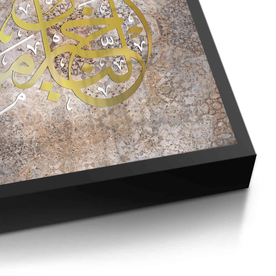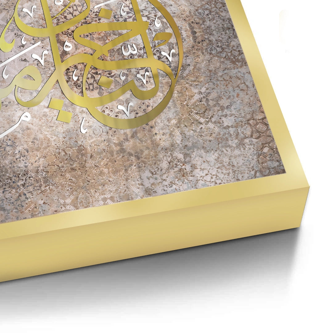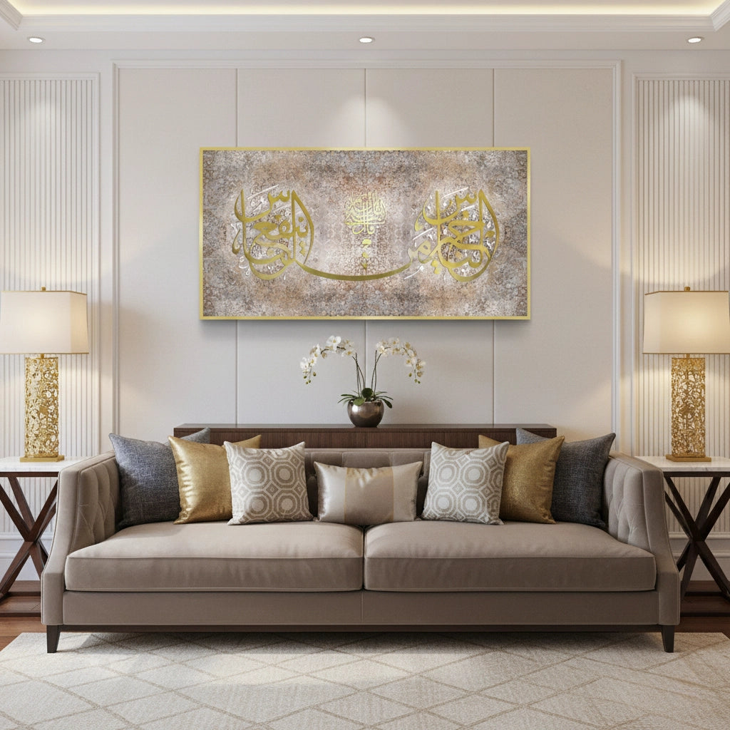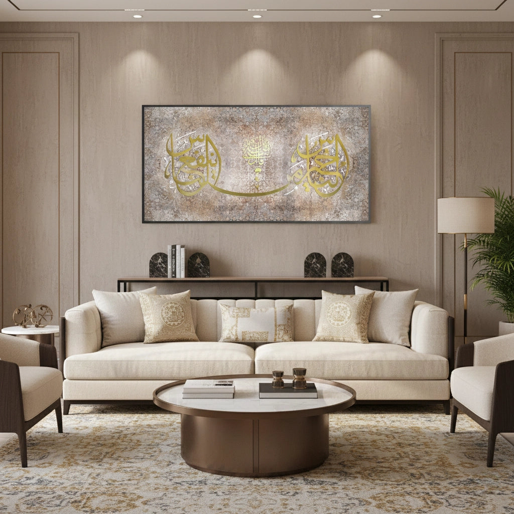 Find solace in the divine promise with Inna Ma’al Usri Yusra from Jasmine Art’s Arabic Calligraphy collection. This panoramic masterpiece features the sacred verse "Verily, with hardship comes ease" in a sweeping metallic gold script, layered over a subtle, vintage-inspired damask background. The sophisticated earthy tones and intricate floral patterns evoke a sense of timeless heritage and spiritual peace. Finished with our signature premium vintage texture, this print offers exceptional tactile depth and a high-end gallery finish. A perfect calming centerpiece for a bedroom, a private library, or a luxury office in Dubai.