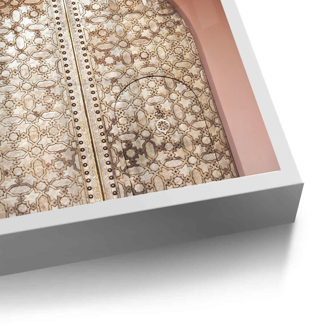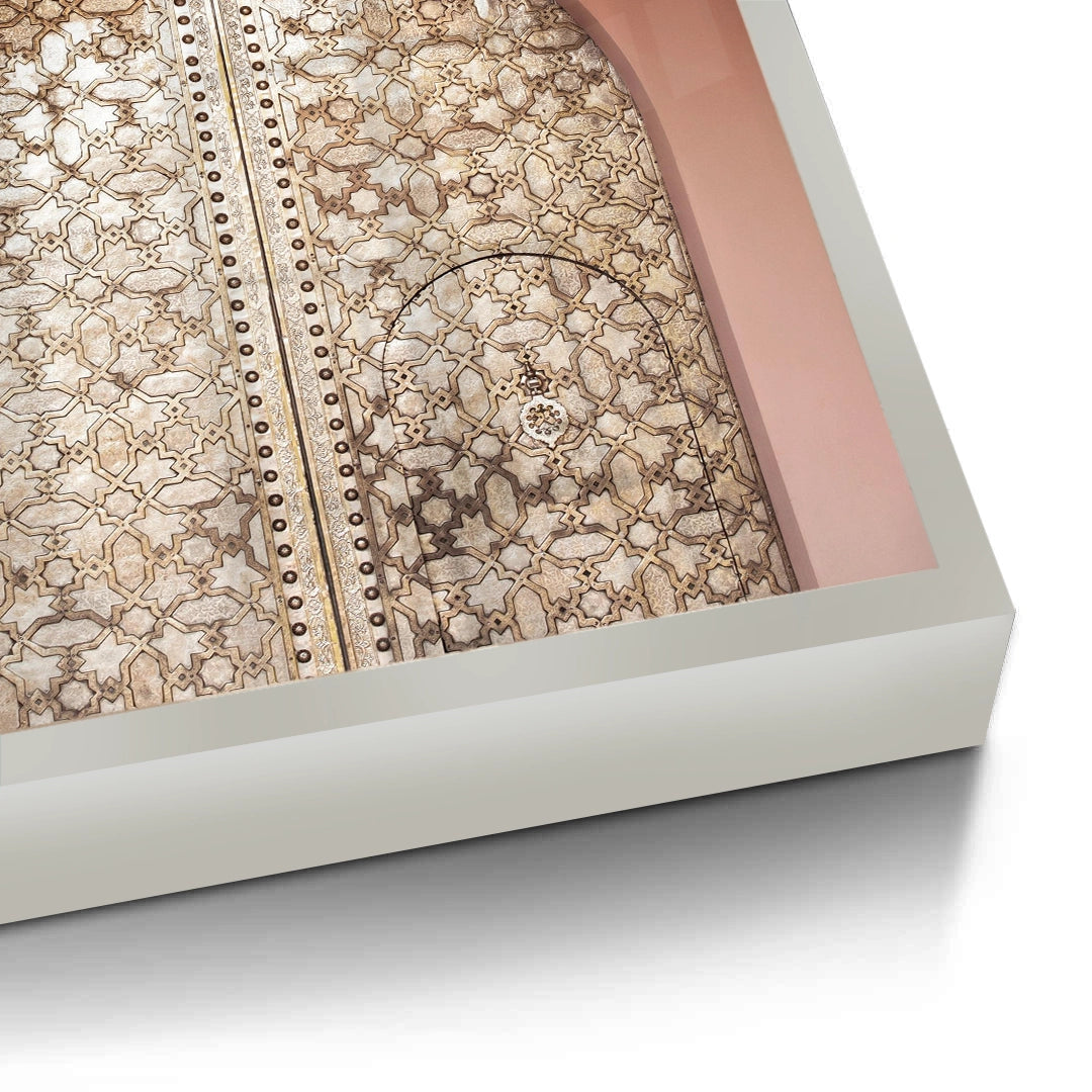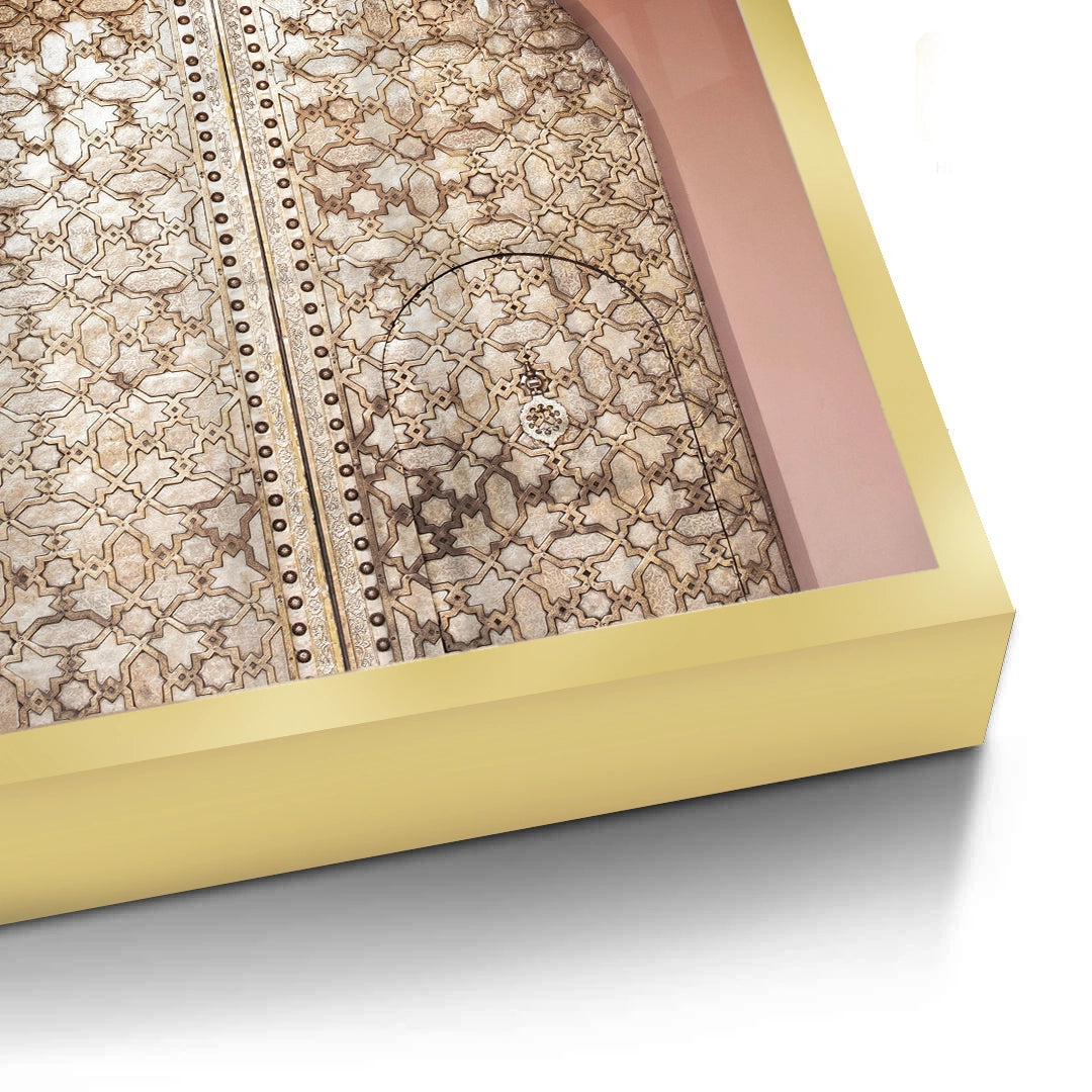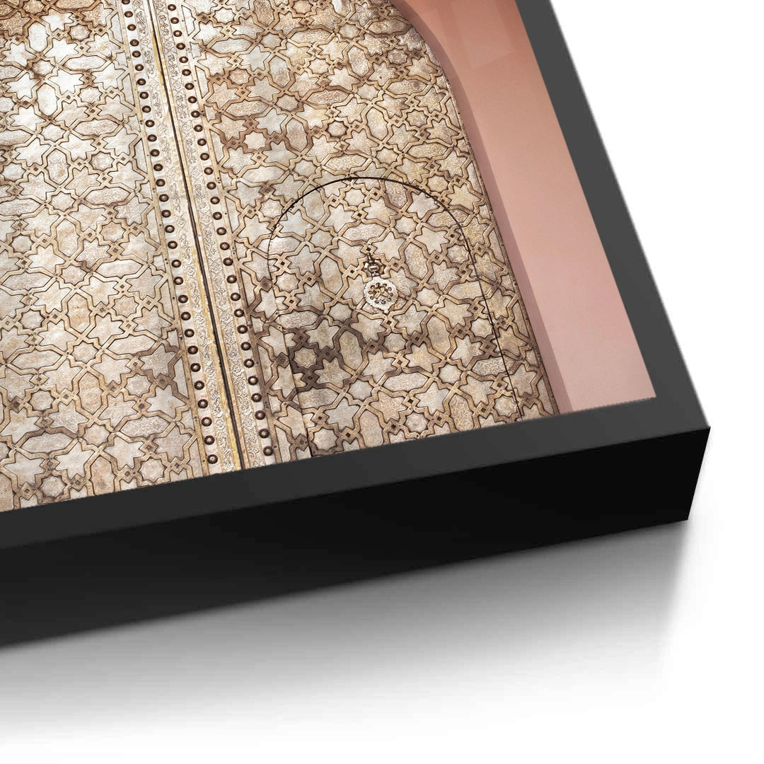 Celebrate the grandeur of cultural craftsmanship with the Islamic Architecture art print. This stunning piece features an intricately carved traditional door set within a graceful pointed arch, showcasing the mesmerizing geometric patterns and rich textures of heritage design. The warm palette of terracotta and aged copper brings a sense of history and regal elegance to any space. Enhanced with our signature premium vertical texture, this print provides a high-end tactile finish that adds depth to the complex motifs. It is an ideal statement piece for a formal majlis, a sophisticated hallway, or a modern office in Dubai.