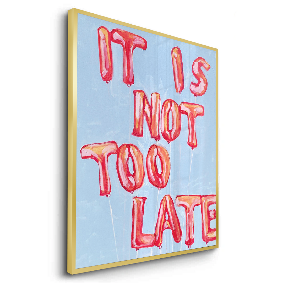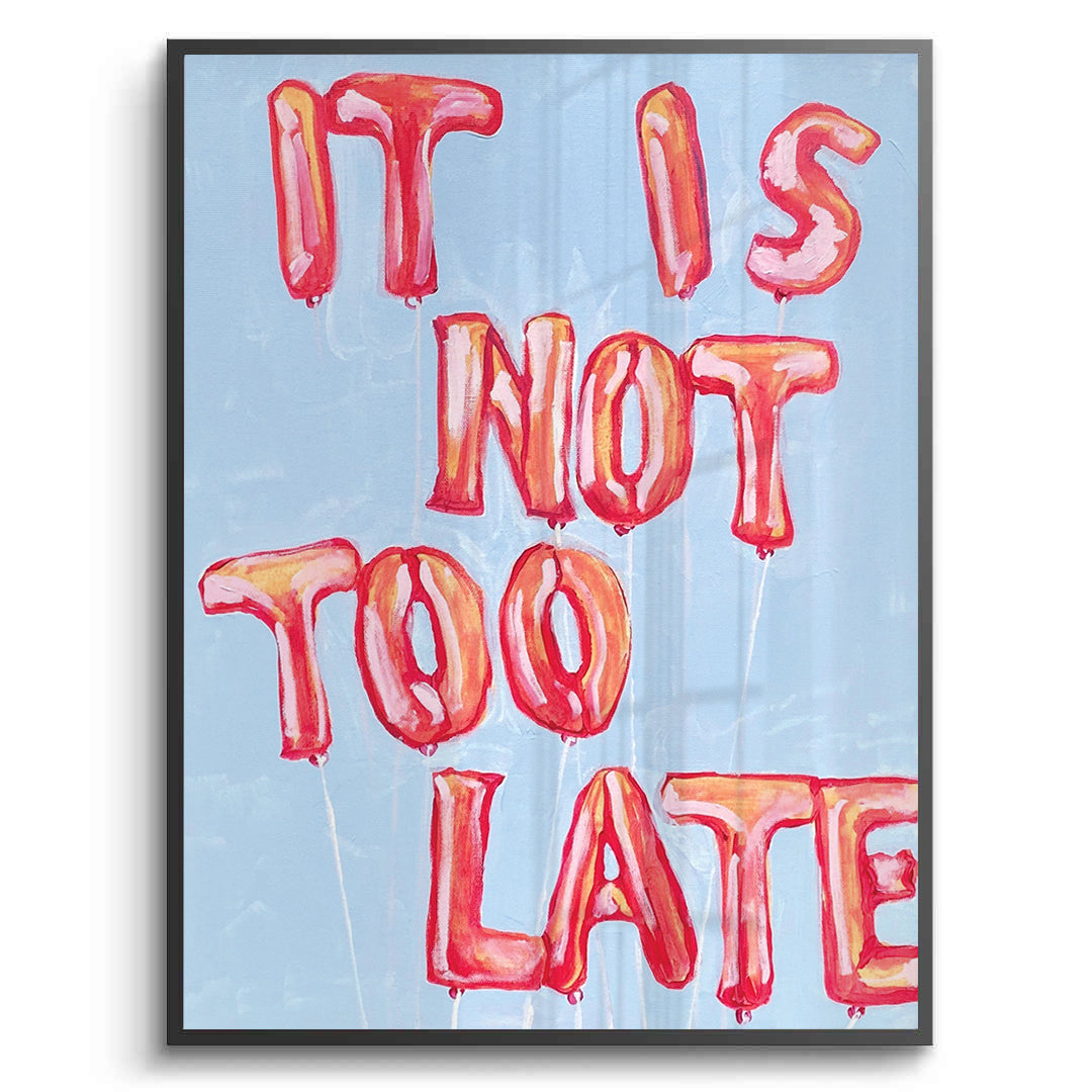 The vibrant It Is Not Too Late - Balloon Typography Art print is a playful and uplifting piece, transforming a motivational message into a party statement. The entire phrase "IT IS NOT TOO LATE" is creatively formed by inflated, glossy reddish-orange foil balloons. These cheerful, three-dimensional letters float against a soft, pastel blue textured canvas. This artwork is perfect for adding a pop of colour, youthful energy, and strong, positive motivation to a teenager's room, creative space, or a bold living area in Dubai.