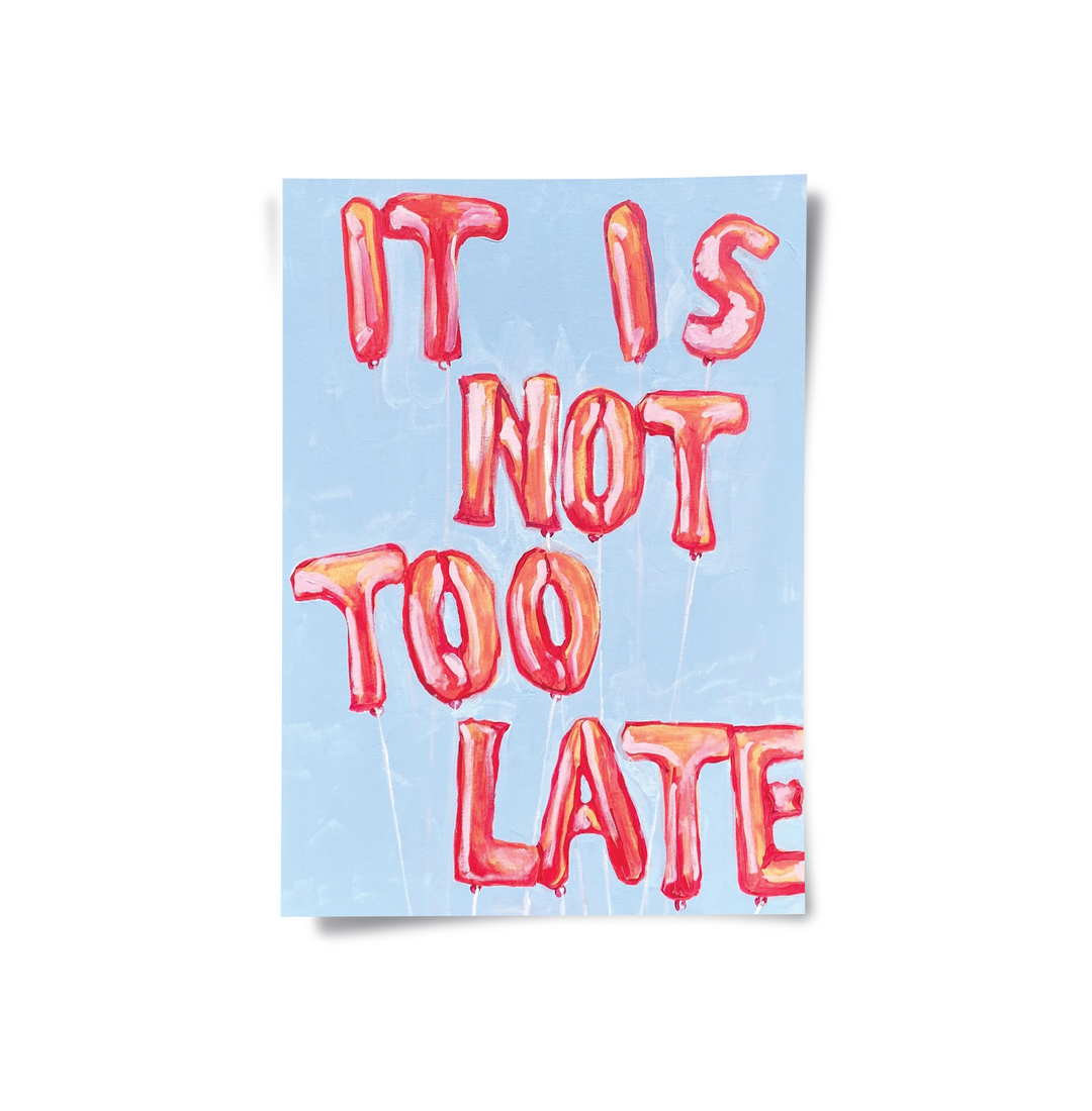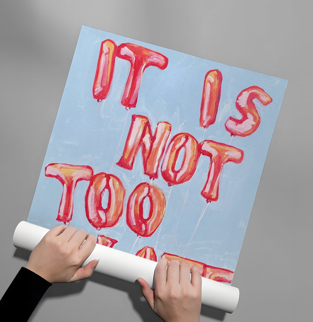 The vibrant It Is Not Too Late - Balloon Typography Art print is a playful and uplifting piece, transforming a motivational message into a party statement. The entire phrase "IT IS NOT TOO LATE" is creatively formed by inflated, glossy reddish-orange foil balloons. These cheerful, three-dimensional letters float against a soft, pastel blue textured canvas. This artwork is perfect for adding a pop of colour, youthful energy, and strong, positive motivation to a teenager's room, creative space, or a bold living area in Dubai.