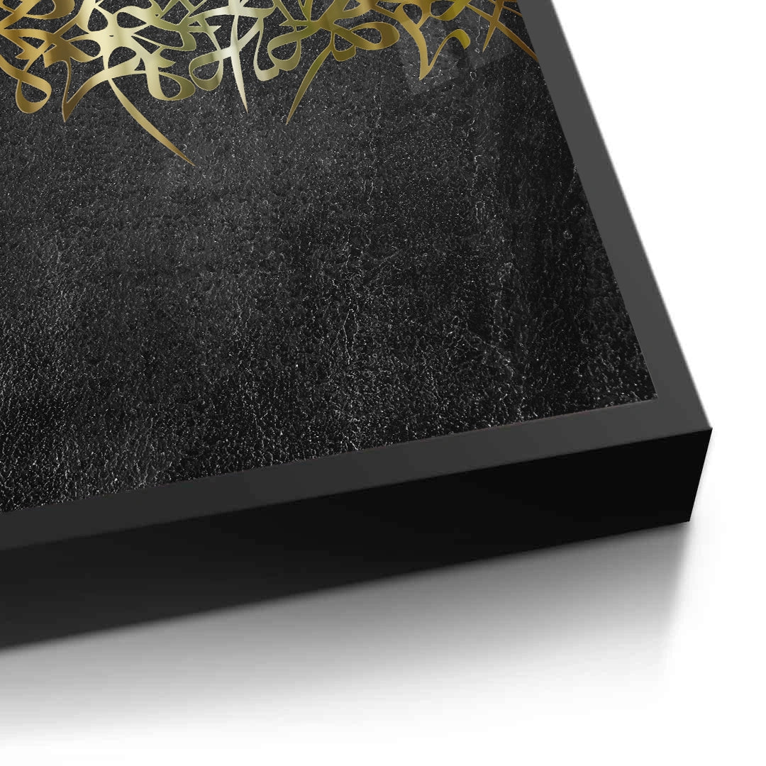 The commanding Khat al-Dhahab - The Golden Script print is a pure celebration of the beauty and opulence of Arabic calligraphy. The piece features a dynamic, multi-layered composition of flowing metallic gold script, expertly concentrated into an abstract corner form. The intense radiance of the luminous gold is dramatically highlighted against a deep black, textured background, creating a powerful sense of depth and luxury. This artwork embodies the phrase 'Golden Script' itself, making it an ideal, sophisticated focal point for a luxury home or executive office in Dubai.