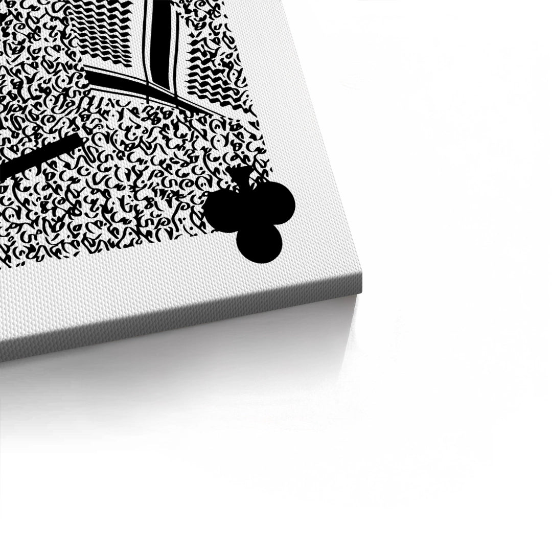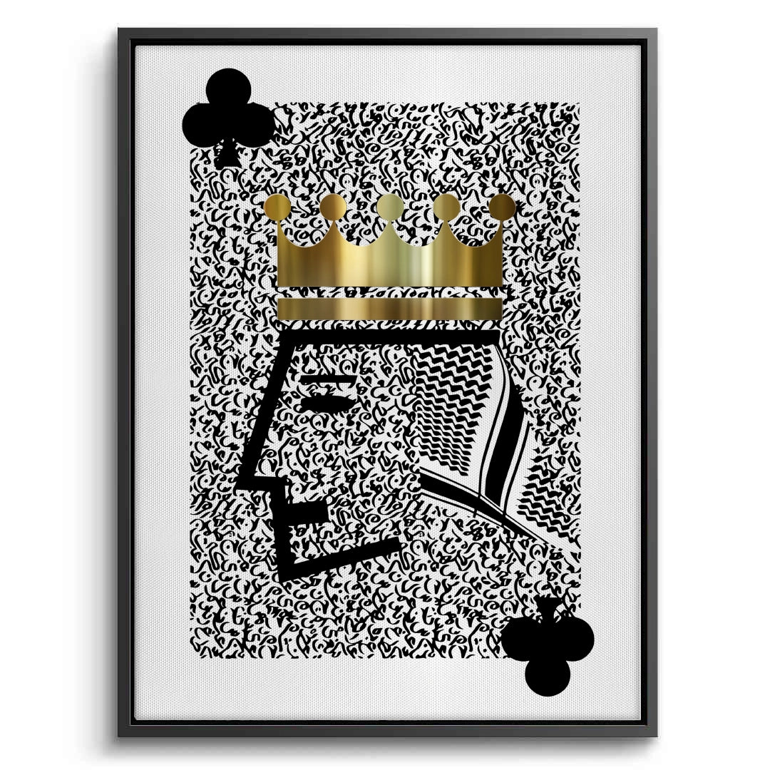The commanding King of Clubs - Modern Arab Card print is a high-impact fusion of modern pop art and Arabian heritage. The King is depicted with bold, geometric lines, crowned by a metallic gold regal crown, and draped in a traditional black and white shemagh/ghutra. The entire background is textured with a dense, chaotic pattern of black abstract Arabic calligraphy. This unique piece adds a bold, masculine, and sophisticated touch. Ideal for a games room, office, or luxury apartment in Dubai.