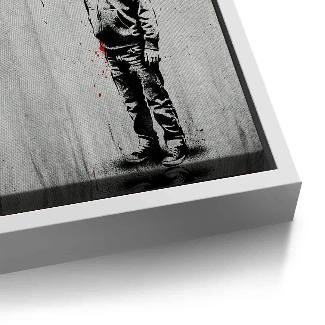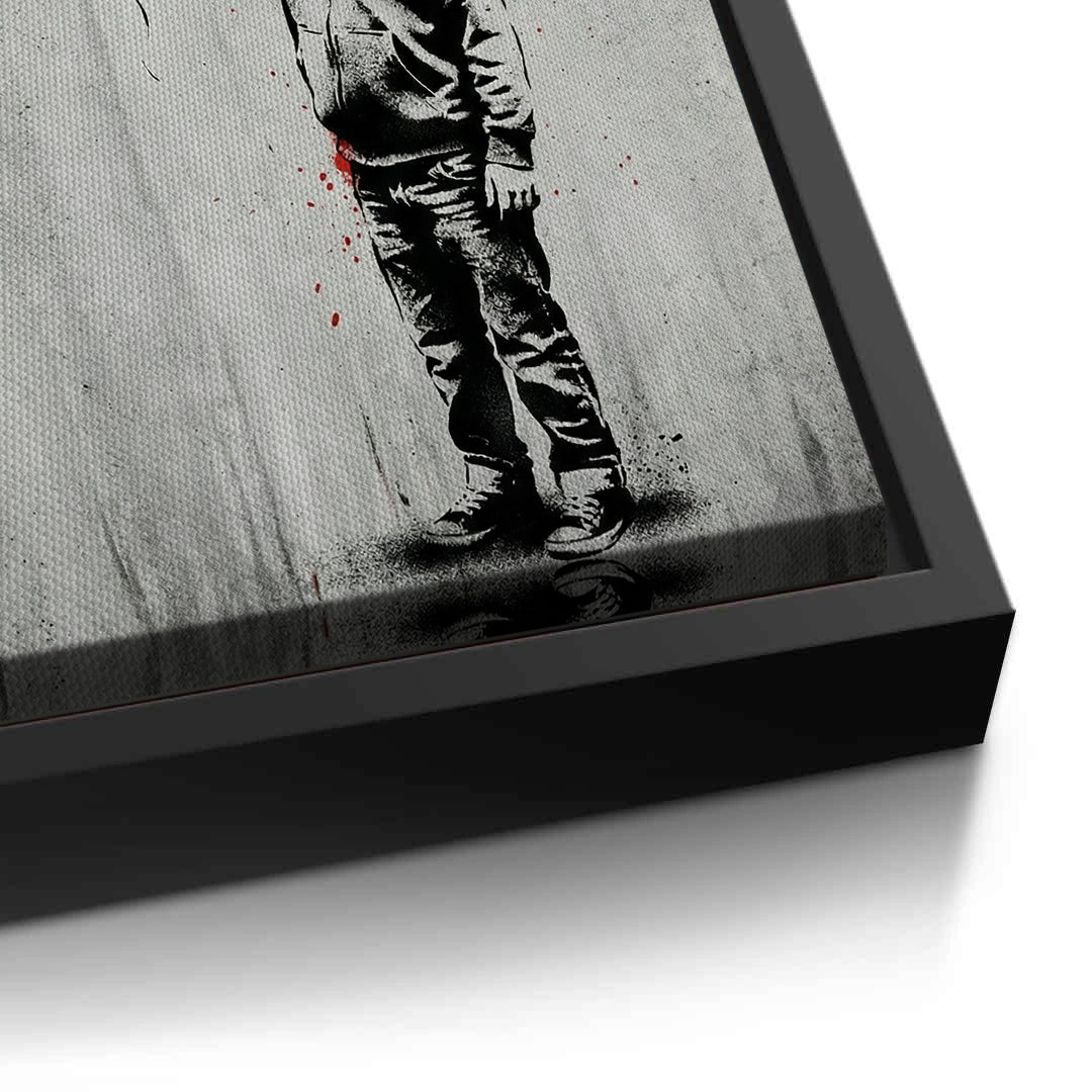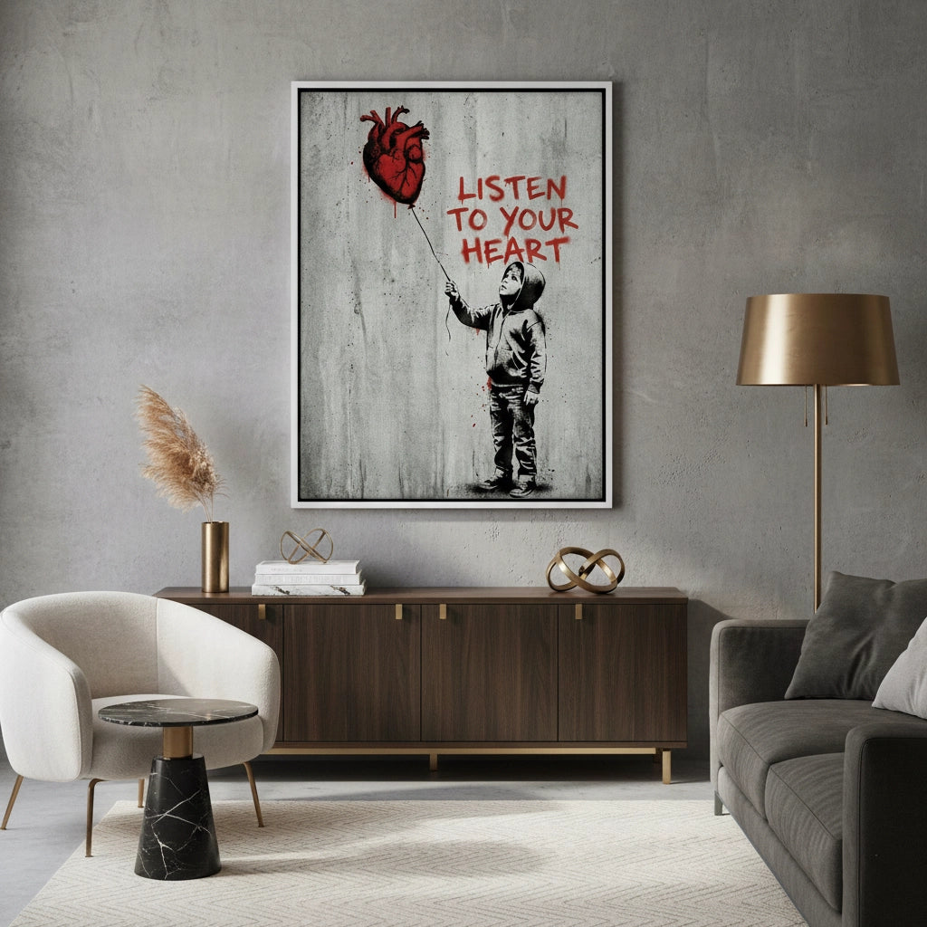 Embrace the power of intuition with the Listen To Your Heart art print from Jasmine Art’s Banksy collection. This profound piece features a stencil-style child holding an anatomical heart balloon, set against a gritty urban backdrop with striking red dripping typography. The emotional contrast between the grayscale figure and the vivid red accents creates a powerful focal point for any modern space. Finished with our signature premium vertical texture, this print offers a high-end tactile finish and gallery-quality depth. A deeply symbolic and stylish addition for a contemporary living room, study, or creative studio in Dubai.
