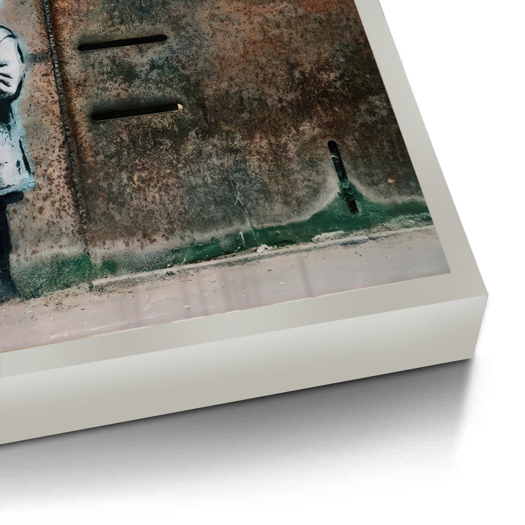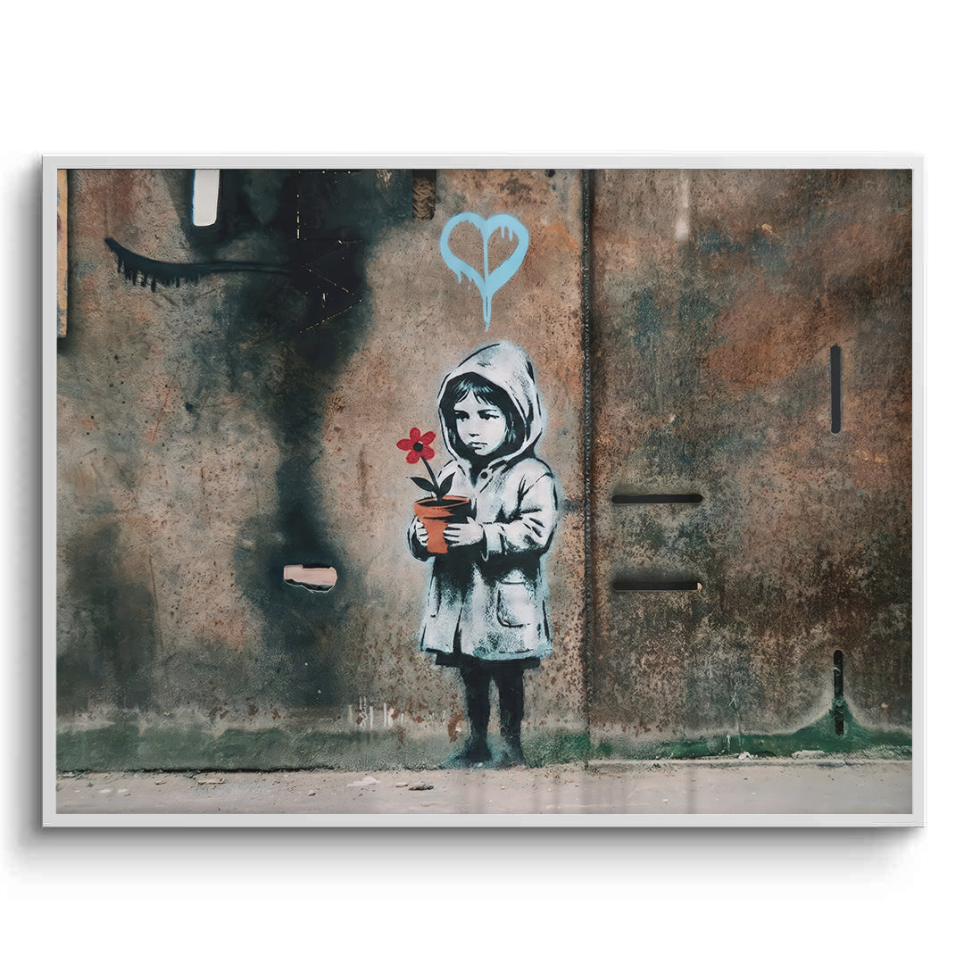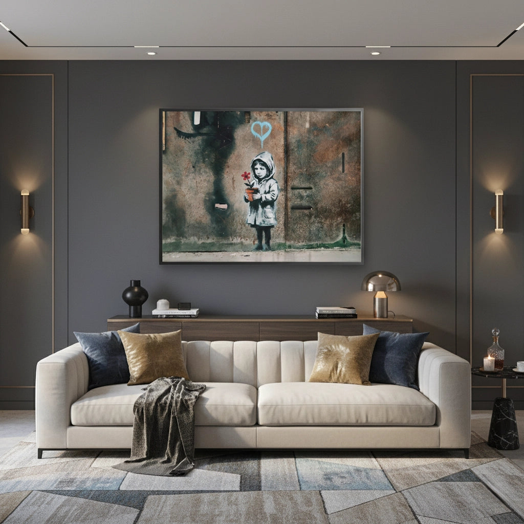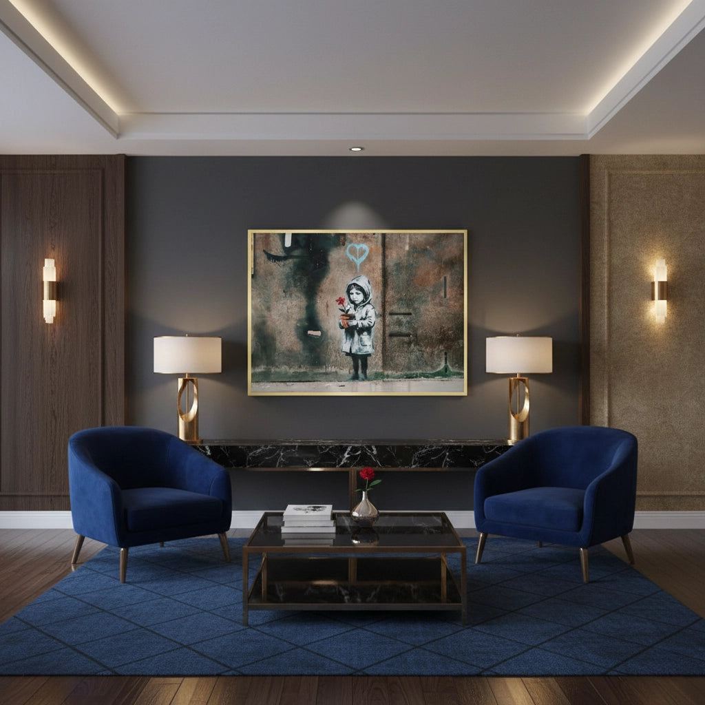 Bring a sense of hope and resilience to your walls with Little Girl with Flower from Jasmine Art’s Banksy series. This moving street-art piece features a young girl holding a single red flower against a backdrop of weathered, industrial texture. The blue dripping heart symbol adds a touch of modern urban poetry to this powerful composition. Finished with our signature premium vertical texture, this print offers exceptional tactile depth and a high-end gallery finish. A perfect emotive statement piece for a contemporary lounge, a creative office, or a modern bedroom in Dubai.