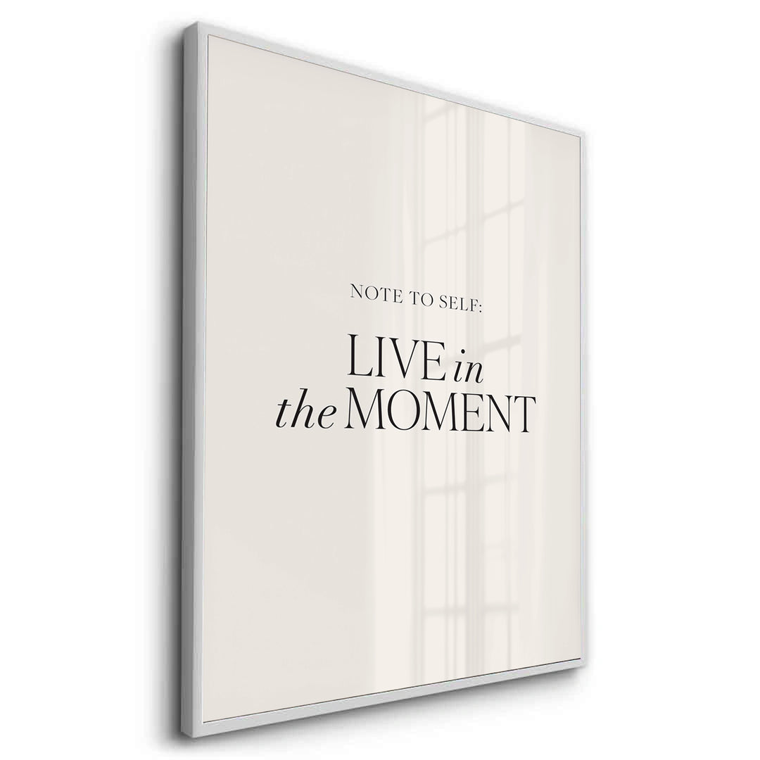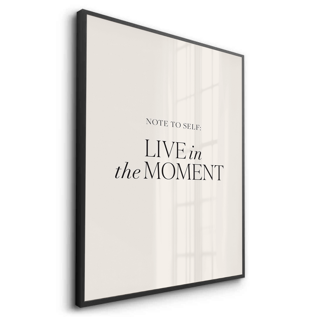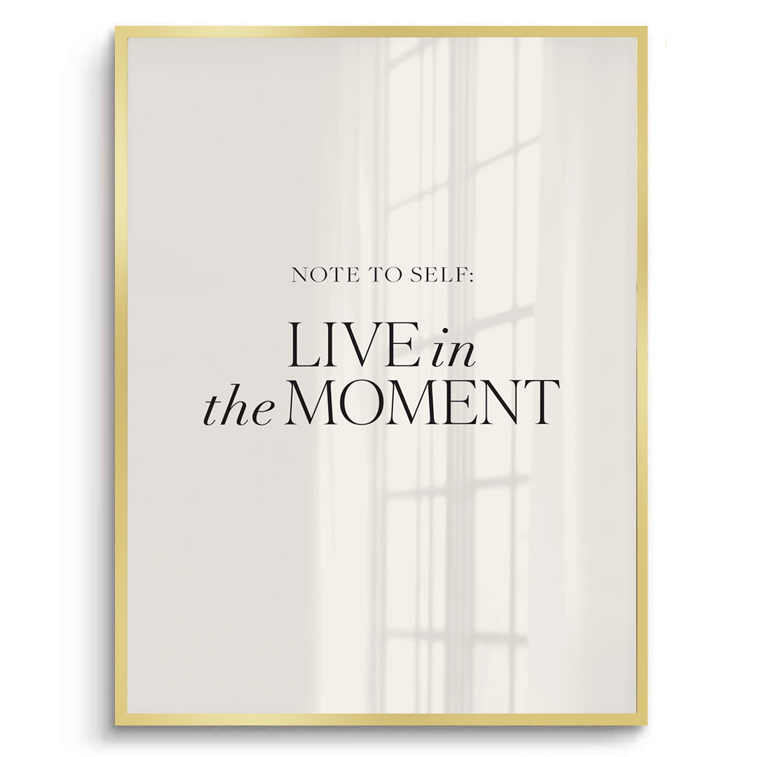 The timeless Live In The Moment - Minimalist Black Typography print is a stylish, mindful reminder for contemporary living. The message, beginning with "NOTE TO SELF:", features the key words "LIVE" and "MOMENT" in large, bold black Serif typography, with the connecting words in an elegant script font. The sophisticated black text creates a clean, sharp contrast against the light, pale nude/grey textured canvas. This minimalist artwork is ideal for adding a chic, calming, and focused accent to a bedroom, office, or meditation space in Dubai.