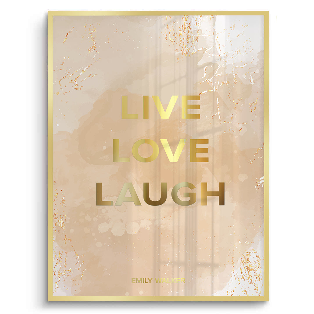 The uplifting Live Love Laugh - Personalized Gold Typography print is a cherished piece that celebrates life's fundamental joys. The classic inspirational mantra "LIVE LOVE LAUGH" is presented in bold, metallic gold, vertically stacked sans-serif typography. The design features elegant abstract gold paint splatters on a soft, nude/beige textured pinstripe canvas. The optional personalized text at the bottom, such as a name, makes this a perfect customizable gift or personalized statement piece for a modern living space or hallway in Dubai.