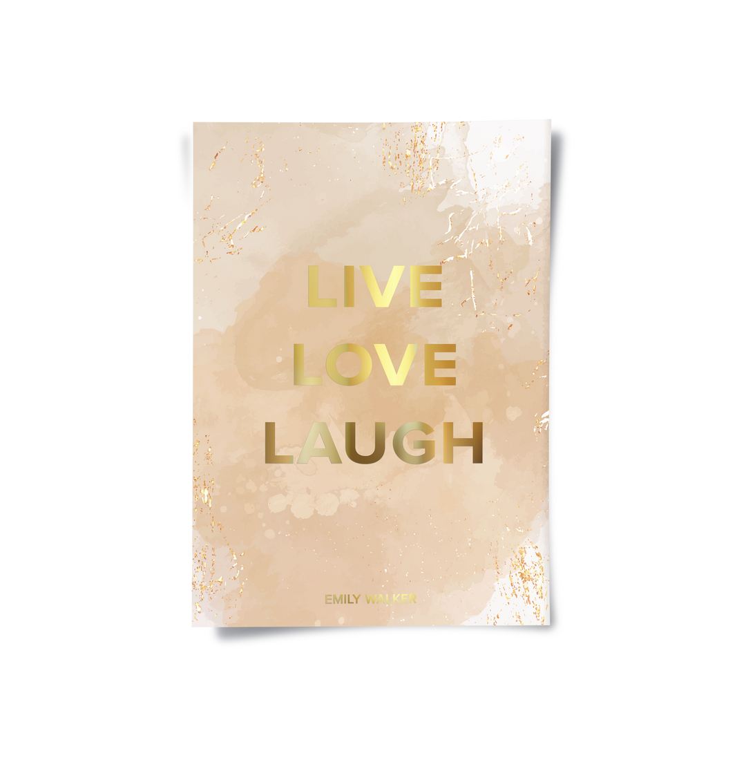 The uplifting Live Love Laugh - Personalized Gold Typography print is a cherished piece that celebrates life's fundamental joys. The classic inspirational mantra "LIVE LOVE LAUGH" is presented in bold, metallic gold, vertically stacked sans-serif typography. The design features elegant abstract gold paint splatters on a soft, nude/beige textured pinstripe canvas. The optional personalized text at the bottom, such as a name, makes this a perfect customizable gift or personalized statement piece for a modern living space or hallway in Dubai.