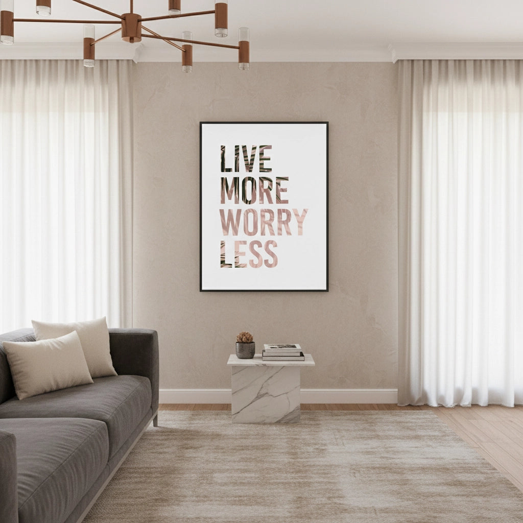 Infuse your space with a sense of calm and positivity with the Live More Worry Less art print from Jasmine Art. This unique piece features bold typography filled with a serene palm leaf double exposure effect in soft pink and green hues. Its minimalist white background highlights the artistic nature-inspired design, making it a perfect daily reminder to embrace the present. Finished with our signature premium vertical texture, this print offers a sophisticated tactile finish and gallery-standard quality. An ideal choice for a sun-drenched living room, a coastal-themed bedroom, or a modern office in Dubai.