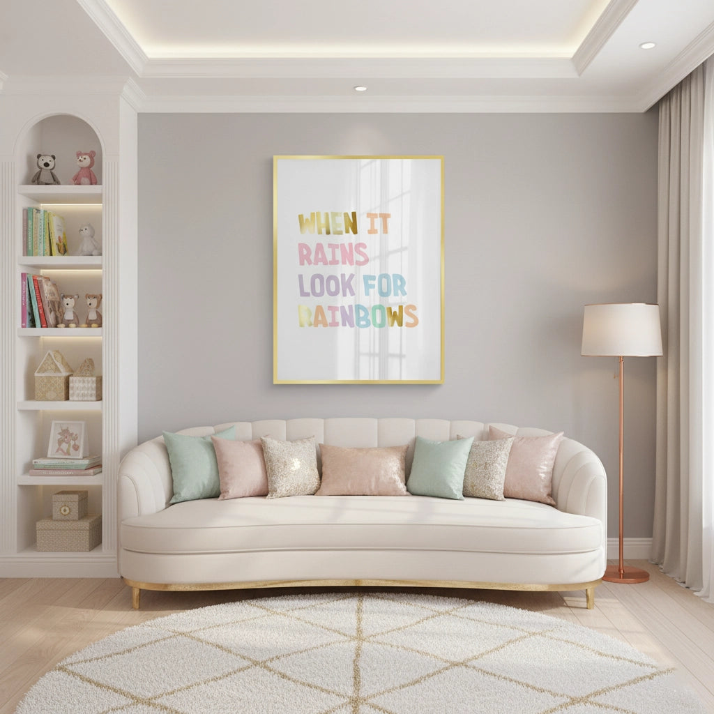 The inspiring and cheerful "Look for Rainbows" print is a wonderful piece of motivational decor for a child's room. This canvas features the uplifting message in a blend of soft pastel colors and bright, shimmering metallic gold text. It serves as a beautiful daily reminder of optimism, adding a touch of luxurious positivity and gentle color to any playroom or nursery in Dubai.
