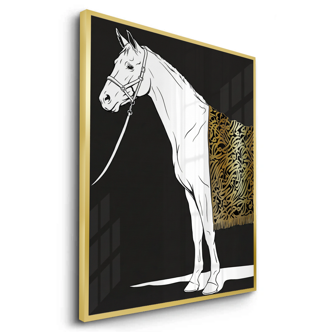 The striking Luxury Arabian Horse - Gold Regalia print is a majestic homage to the region's noble heritage and equestrian pride. The artwork features the elegant silhouette of a purebred Arabian horse against a deep black backdrop, its form highlighted in stark white. The horse is adorned with a lavish metallic gold blanket, entirely composed of dense, intricate Arabic calligraphy. This piece offers a dramatic blend of fine art illustration and luxurious script. Ideal for adding an opulent, sophisticated, and culturally rich focal point to a majlis or luxury home in Dubai.