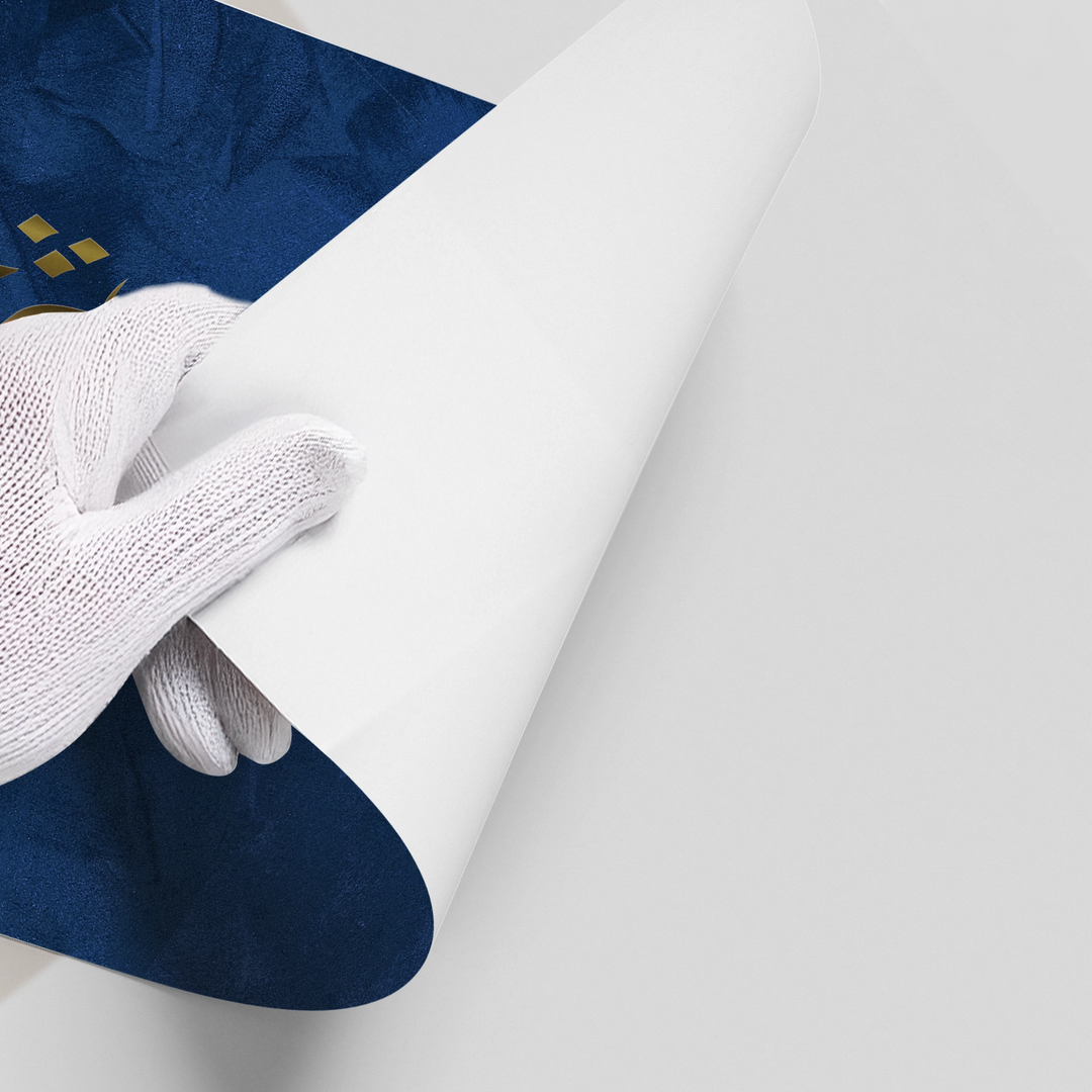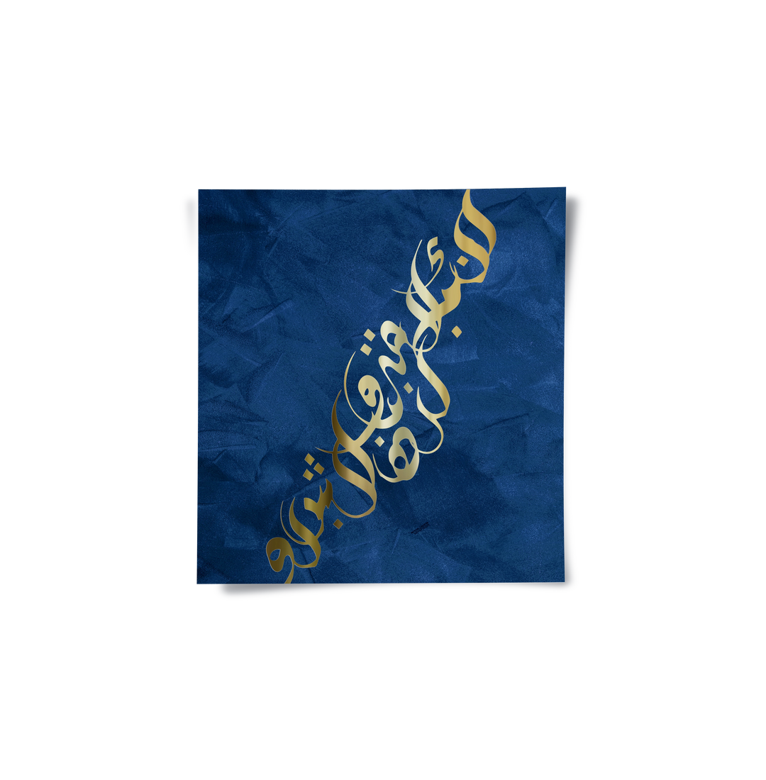 The opulent Luxury Gold Arabic Calligraphy - Navy print is a striking piece that radiates sophistication and modern luxury. This captivating artwork features free-flowing Arabic script in exquisite metallic gold foil, set against a rich, deeply textured navy blue background. The combination of deep blue and shimmering gold creates a dramatic and regal statement. Ideal for adding a bold, contemporary, and luxurious cultural accent to any upscale living room or office in Dubai.