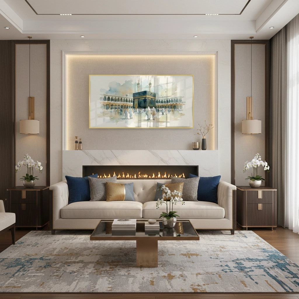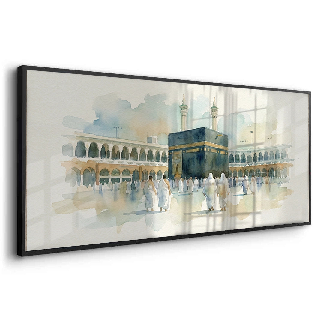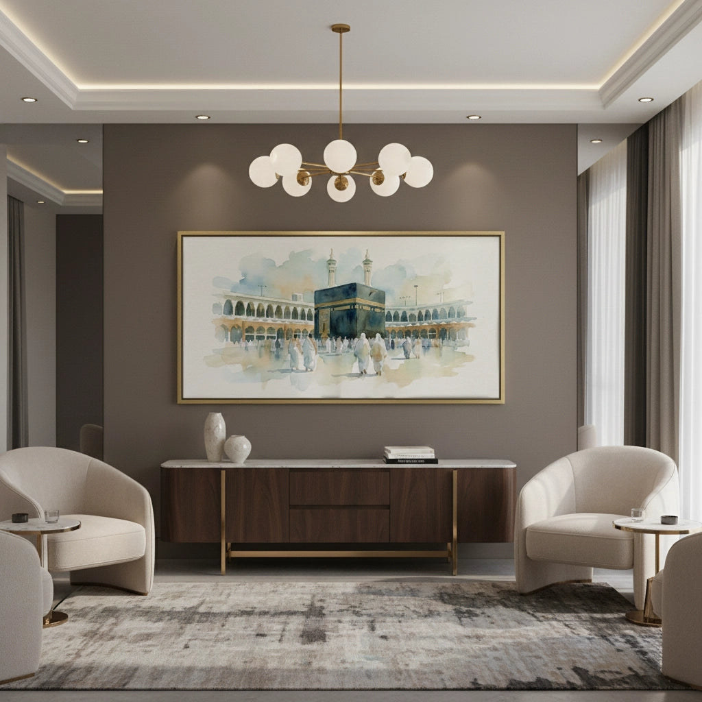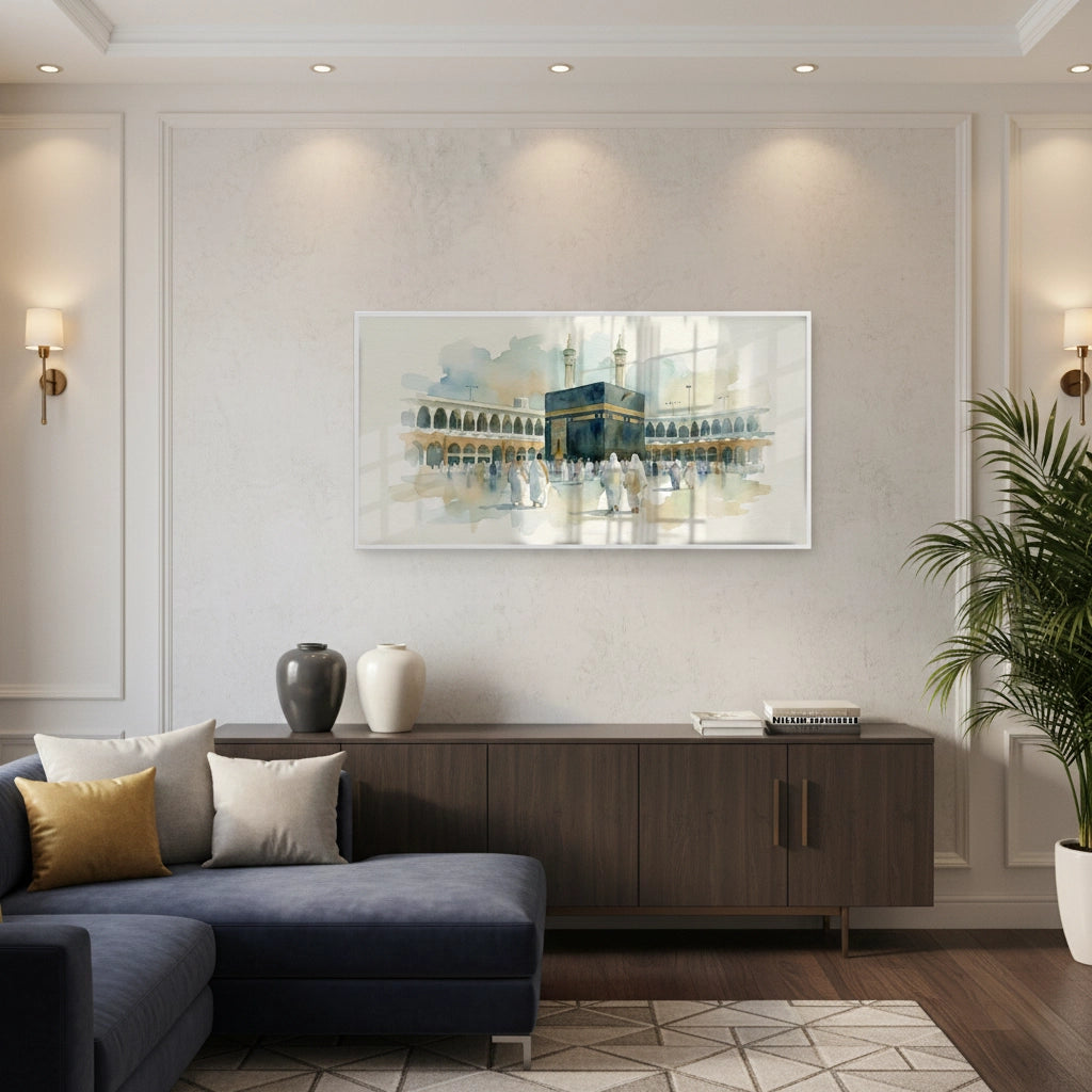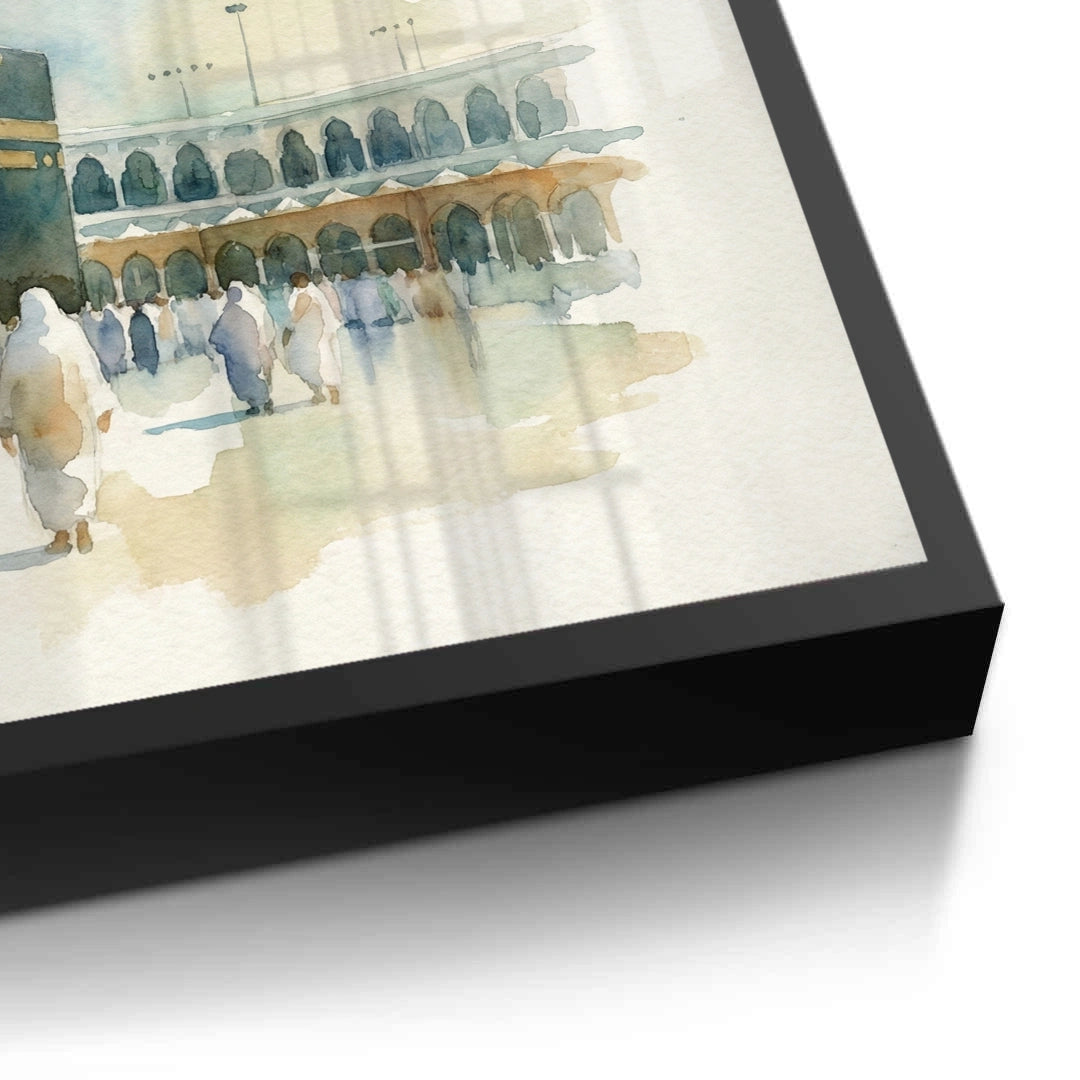 The serene Mecca Watercolor - The Holy Kaaba print captures the spiritual heart of Islam with exquisite tenderness. This beautiful artwork is a soft, ethereal watercolor painting of the Kaaba in Al-Haram Mosque, surrounded by pilgrims. The muted palette of earthy tones and delicate blue washes gives the scene a peaceful, devotional, and profound atmosphere. Ideal for adding a calm, spiritual, and meaningful architectural focal point to a prayer room, living room, or study in Dubai.