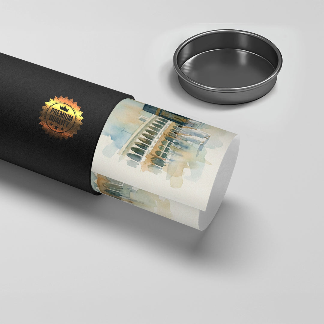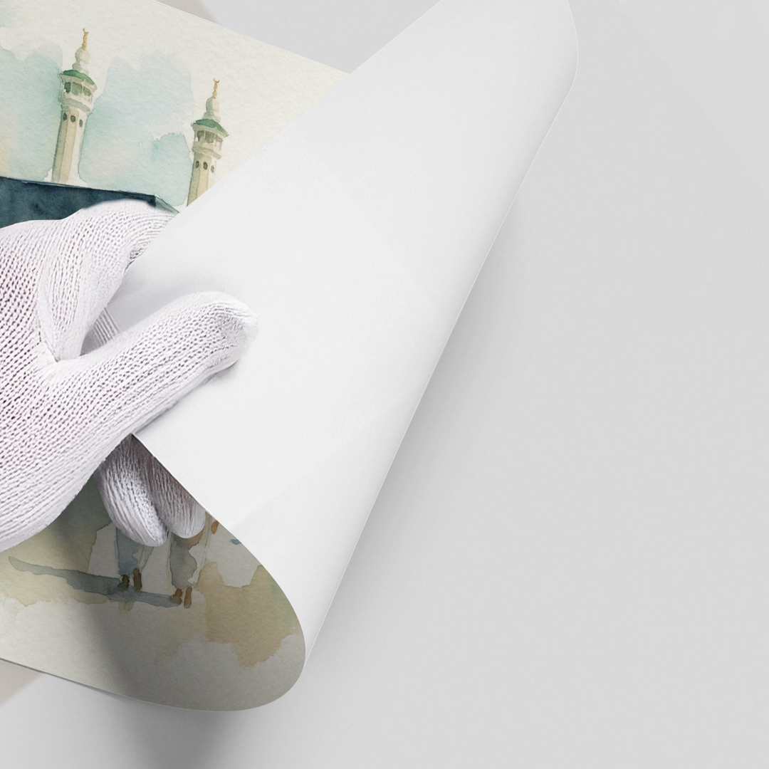The serene Mecca Watercolor - The Holy Kaaba print captures the spiritual heart of Islam with exquisite tenderness. This beautiful artwork is a soft, ethereal watercolor painting of the Kaaba in Al-Haram Mosque, surrounded by pilgrims. The muted palette of earthy tones and delicate blue washes gives the scene a peaceful, devotional, and profound atmosphere. Ideal for adding a calm, spiritual, and meaningful architectural focal point to a prayer room, living room, or study in Dubai.