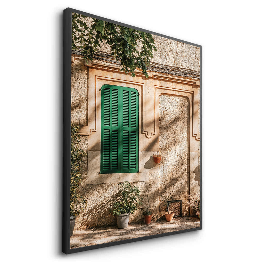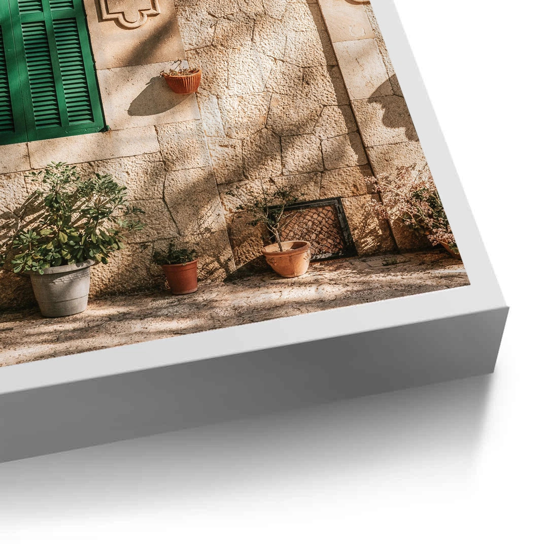 Capture the sun-drenched charm of a European summer with the Mediterranean Green Shutters art print. This evocative piece features a textured stone wall adorned with vibrant emerald green shutters, beautifully framed by the dancing shadows of nearby foliage. The addition of rustic terracotta pots at the base brings a touch of organic warmth and authentic coastal life to the composition. Finished with our signature premium vertical pinstripe texture, this print offers a high-end tactile feel that elevates any space. It is the perfect choice for creating a cozy, inviting focal point in a rustic-themed dining room, a bright kitchen, or a Mediterranean-style home in Dubai.