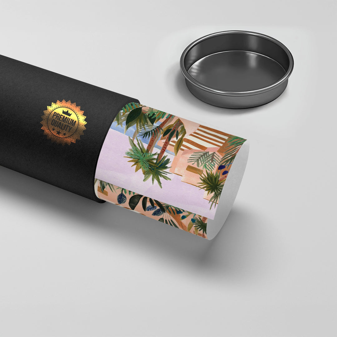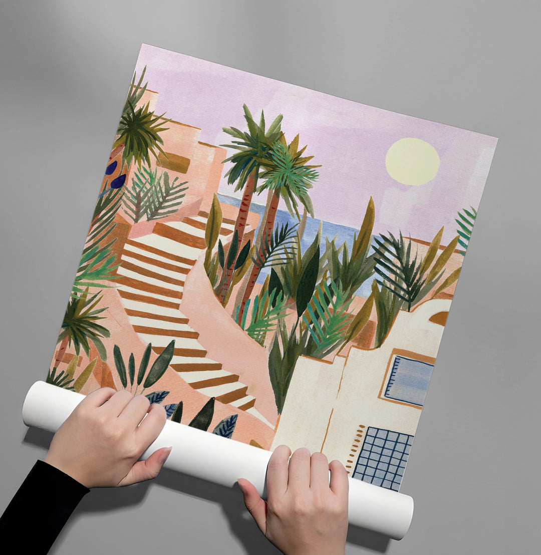 The vibrant Mediterranean Terracotta Steps print captures the lush, sun-drenched beauty of a coastal European villa. This contemporary watercolor-style artwork depicts white stucco architecture and winding terracotta steps, overflowing with rich, tropical green foliage and palm trees. With a glimpse of the blue sea and a gentle sun in the lavender sky, this piece evokes a feeling of summer escape and exotic elegance. It is an ideal piece for adding warmth, color, and Mediterranean charm to any sunlit room in Dubai.